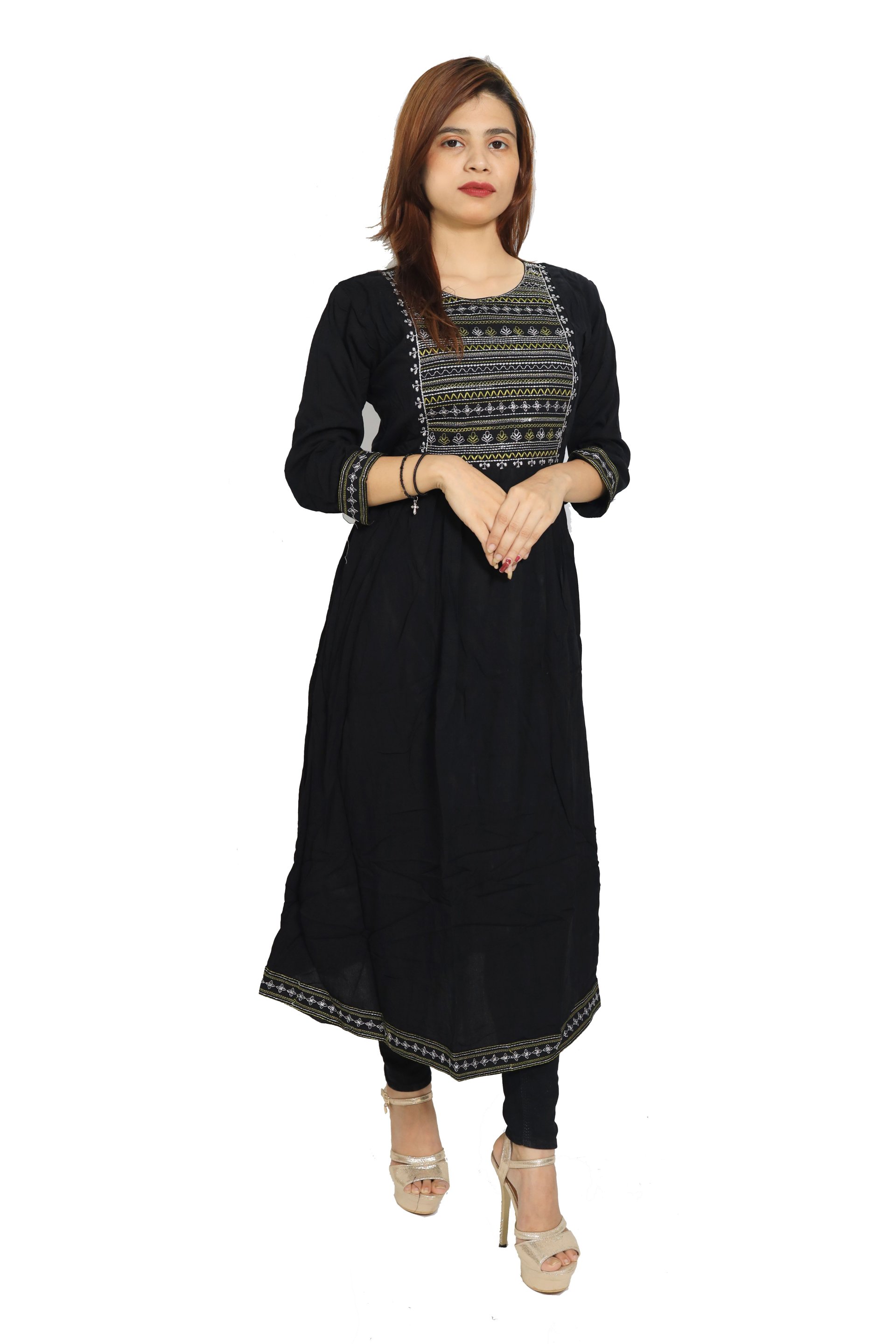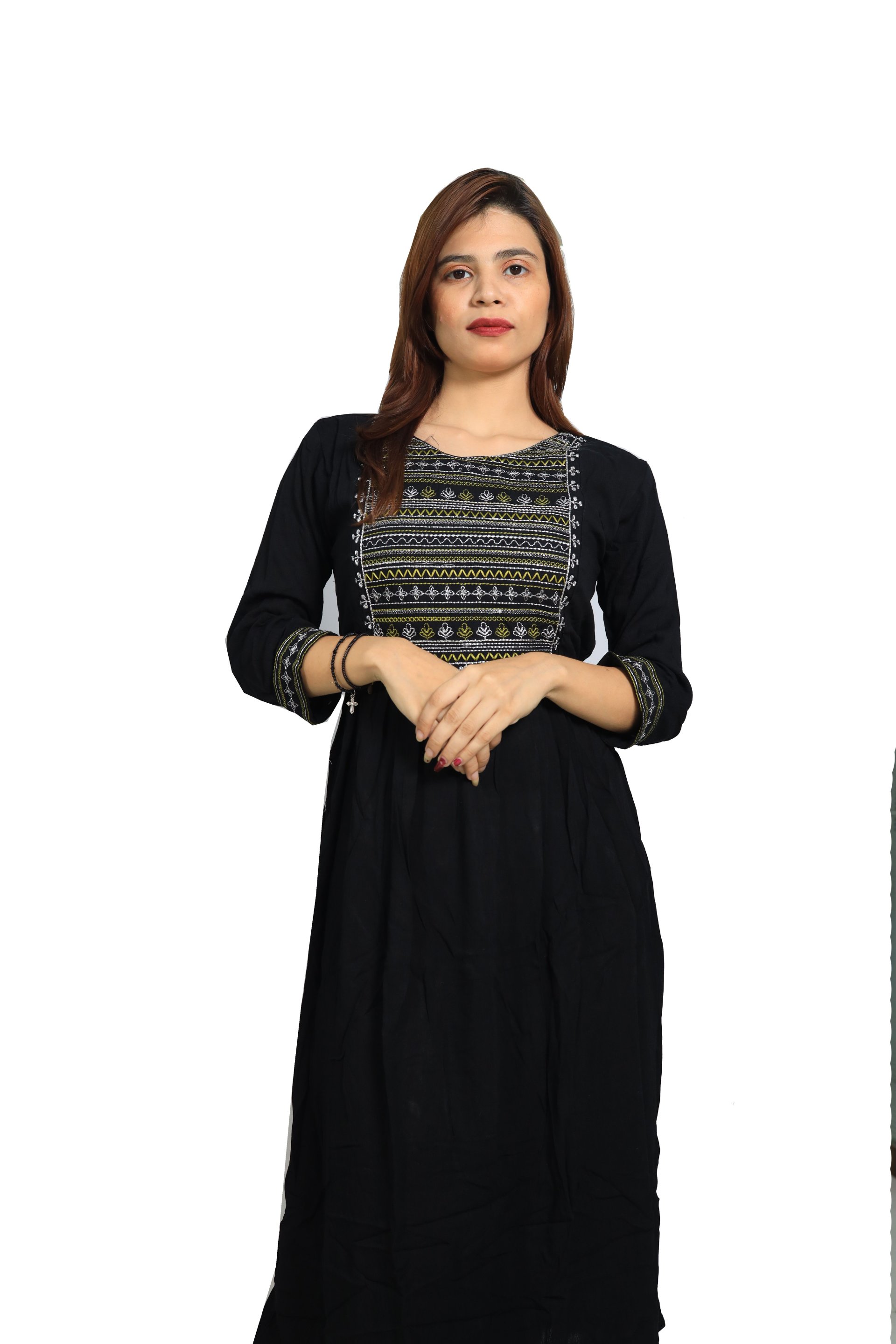 Curved horizontal lines embroided straight Kurti for Womens/ girls (black kurti)- Made up of Rayon and designed for you plesant and comfy