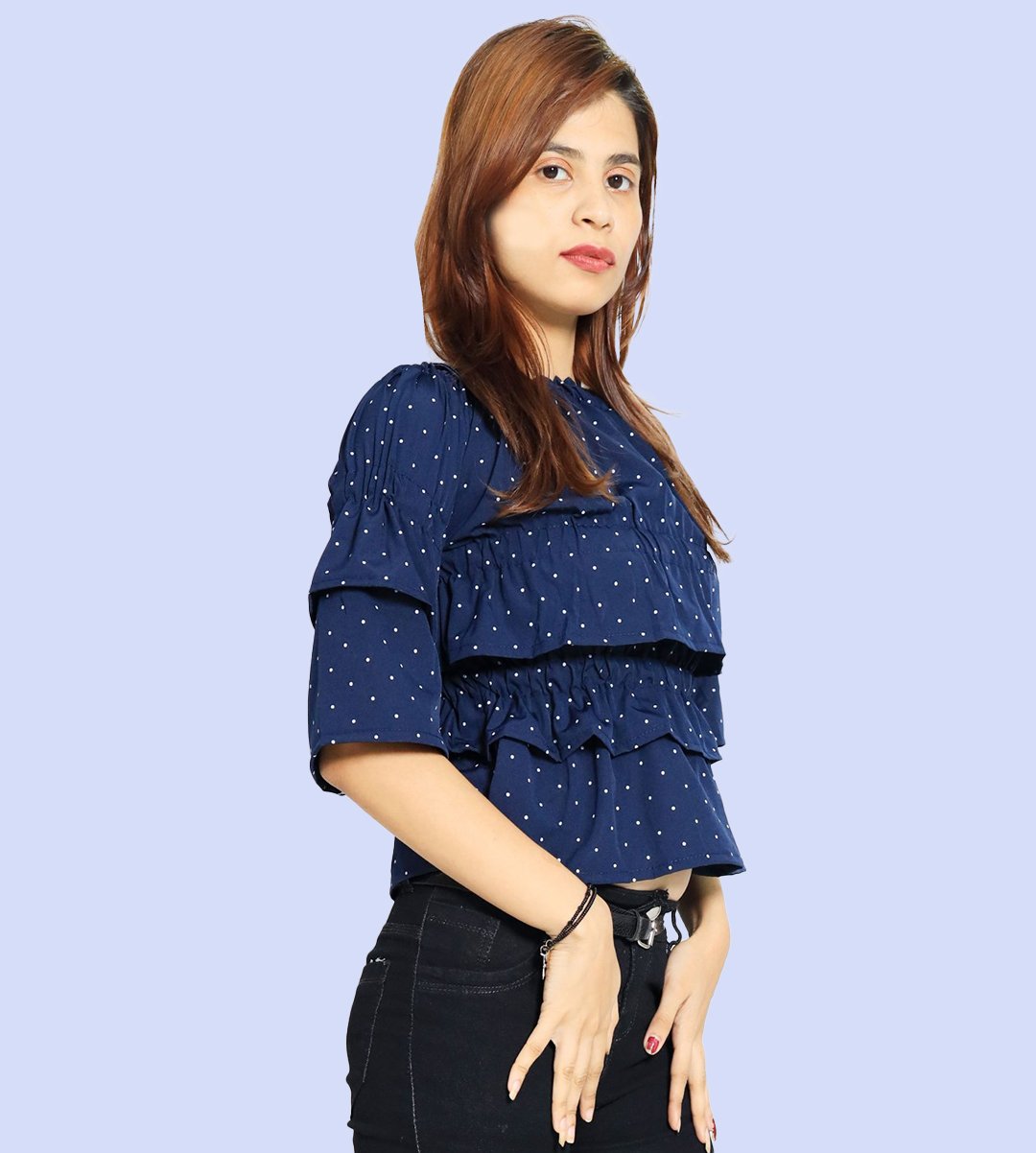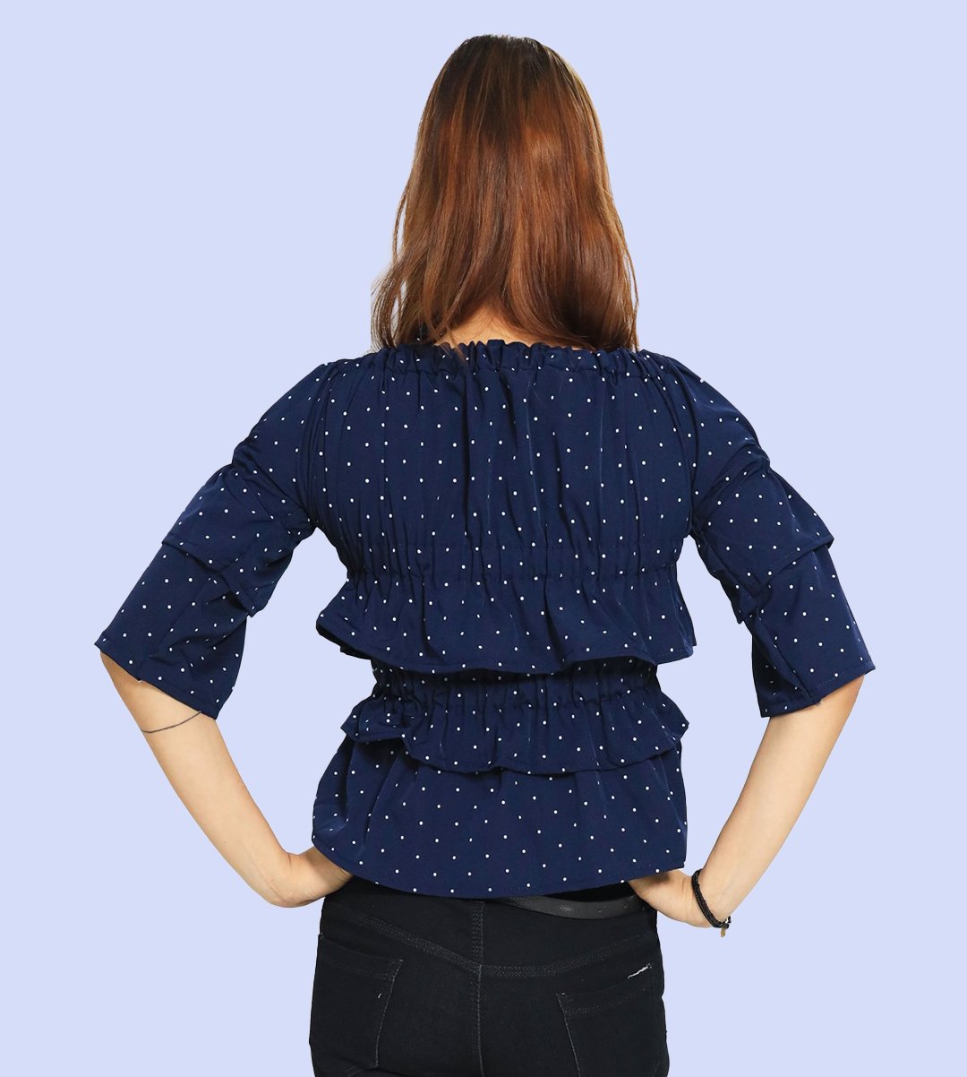 White potka dots, squeezed in center floral womens printed top (dark blue top) - Made up of Rayon for your plesant and cozy