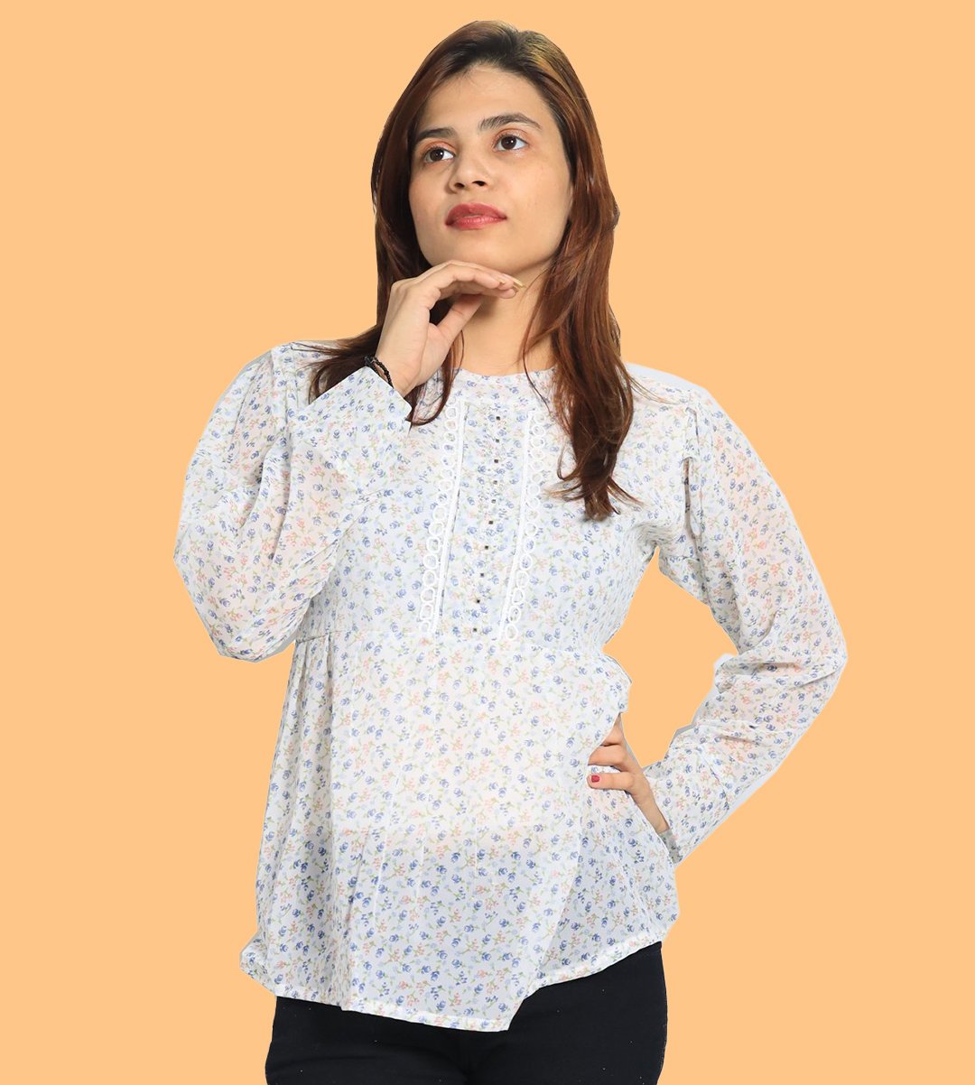 Women loves to wear top of any age groups. The fashion is not only limited upto young girls / teenagers but some married women also love to wear it. The recognization of top is very much popular in 21st century. It is used by the modernized ladies. Easy to wear. It looks good with jeans or jeggings. We have brought you a full collection of floral designs printed top to choose from. This is made up of Rayon and designed for your plesant and cozy.
