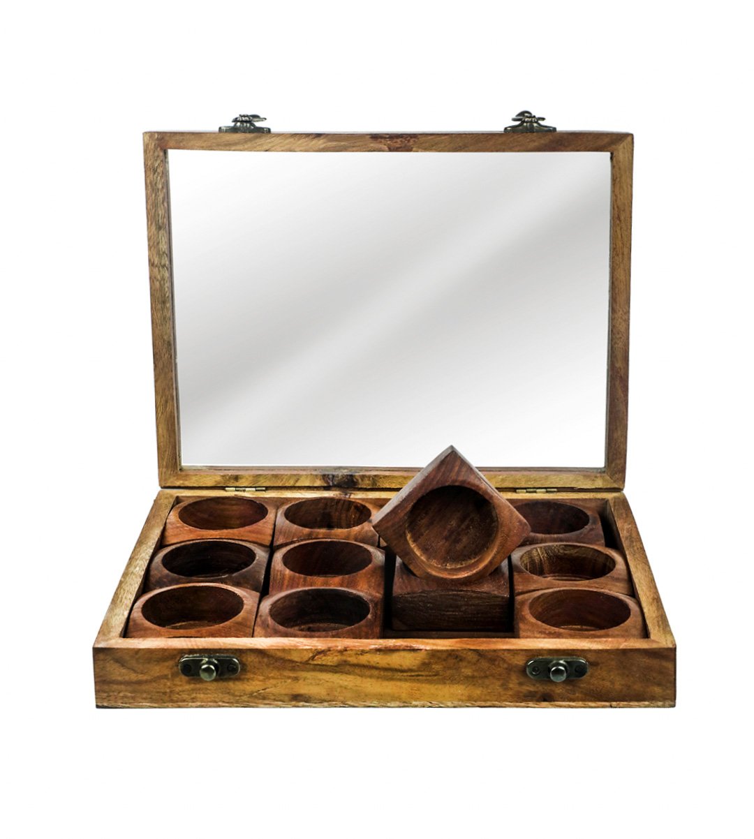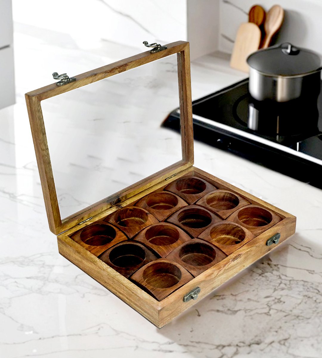 Wooden spicebox is used to keep spices like garam masala, aniseed, tea leaves, coffee powder, peppers etc. It is made up of wood with artistry and great finishing. It has a closure transparent lid to cover the spices. It will be easy for people to find out from the glass that in which column, the vernecular spices are kept. The vision looks attractive and its artisans is based from every parts of India. The craftsman is making the product with miniature details on it. We have brought you many wooden and stylish wooden spicebox of different designs. Grab it now. It could be a memorable gift for birthdays, it can be a memorable return gift. What can be a better gift than an unique wooden spicebox for your loved ones? Gift material to friends, mothers, aunts and dear ones.