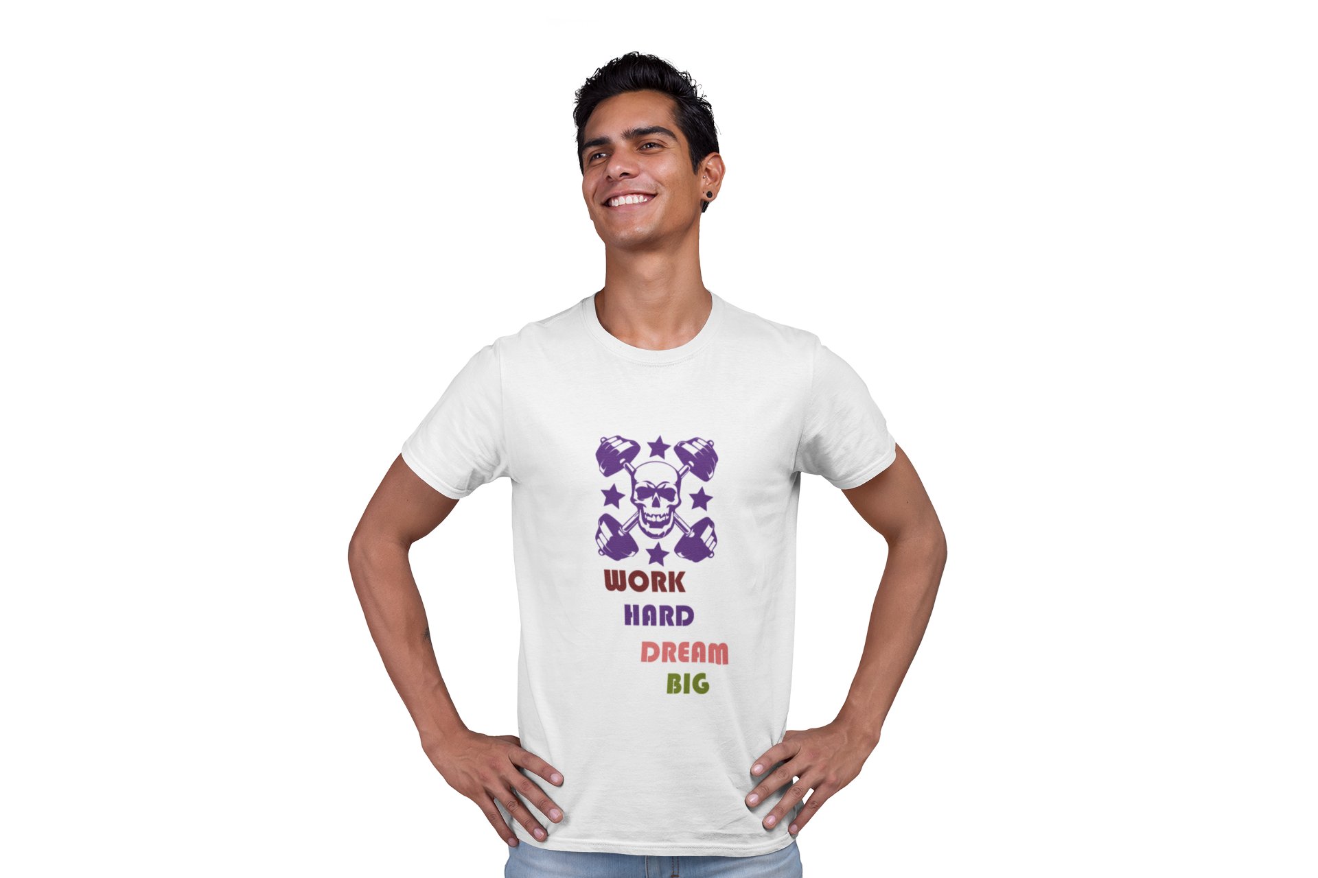 Work Hard, Dream Big, (BG Violet Skull), Round Neck Gym Tshirt (White Tshirt) - Clothes for Gym Lovers - Suitable for Gym Going Person - Foremost Gifting Material for Your Friends and Close Ones