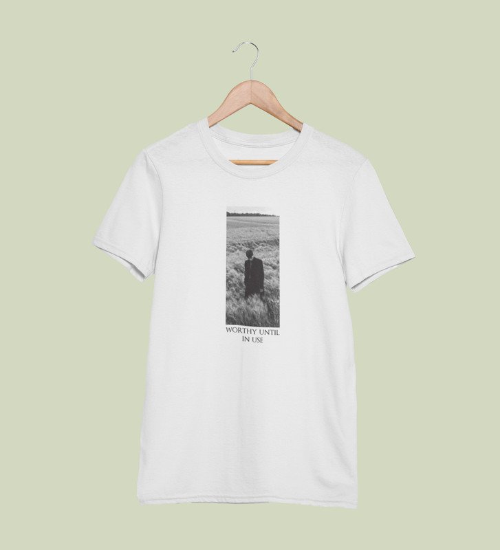 Worthless Life, Cityscape Elegance: White Men's Oversized Tee with Captivating Front Graphic