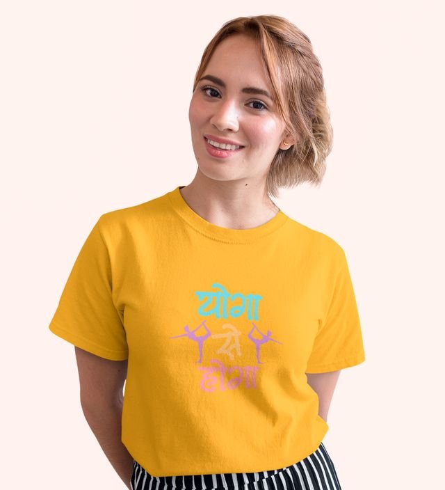 Yoga Se Hoga! Yellow Round Neck Cotton Half Sleeved Women T-Shirt with Printed Graphics