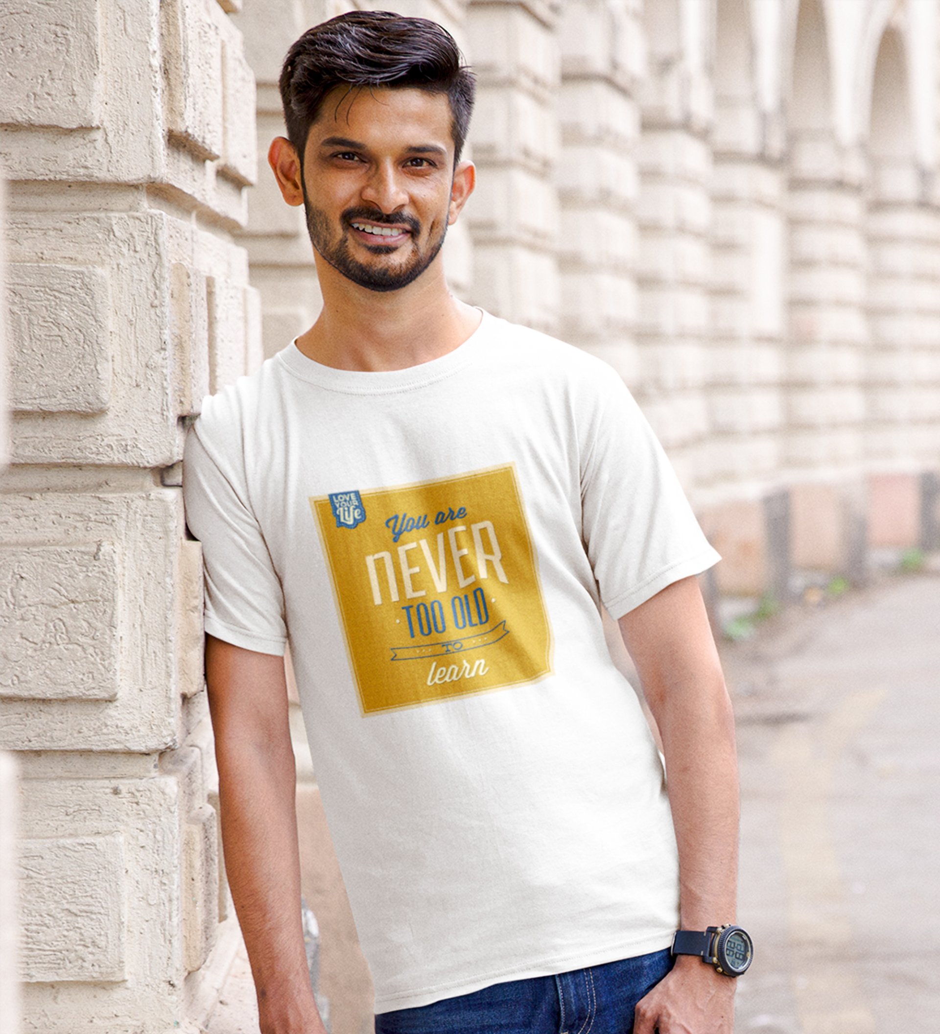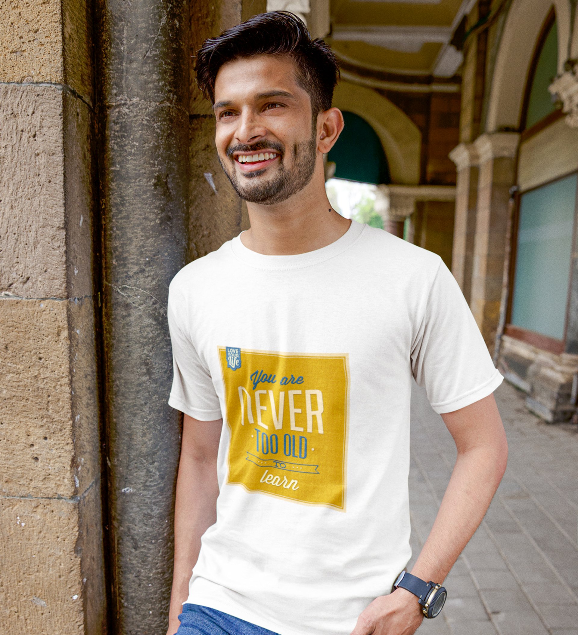 It's Never Too Late White Round Neck Cotton Half Sleeved Men's T-Shirt with Printed Graphics