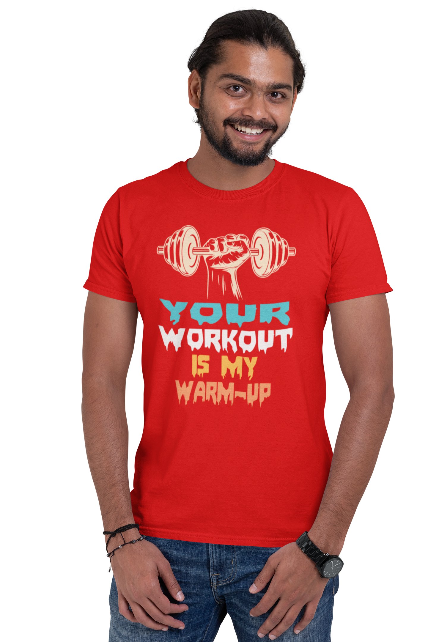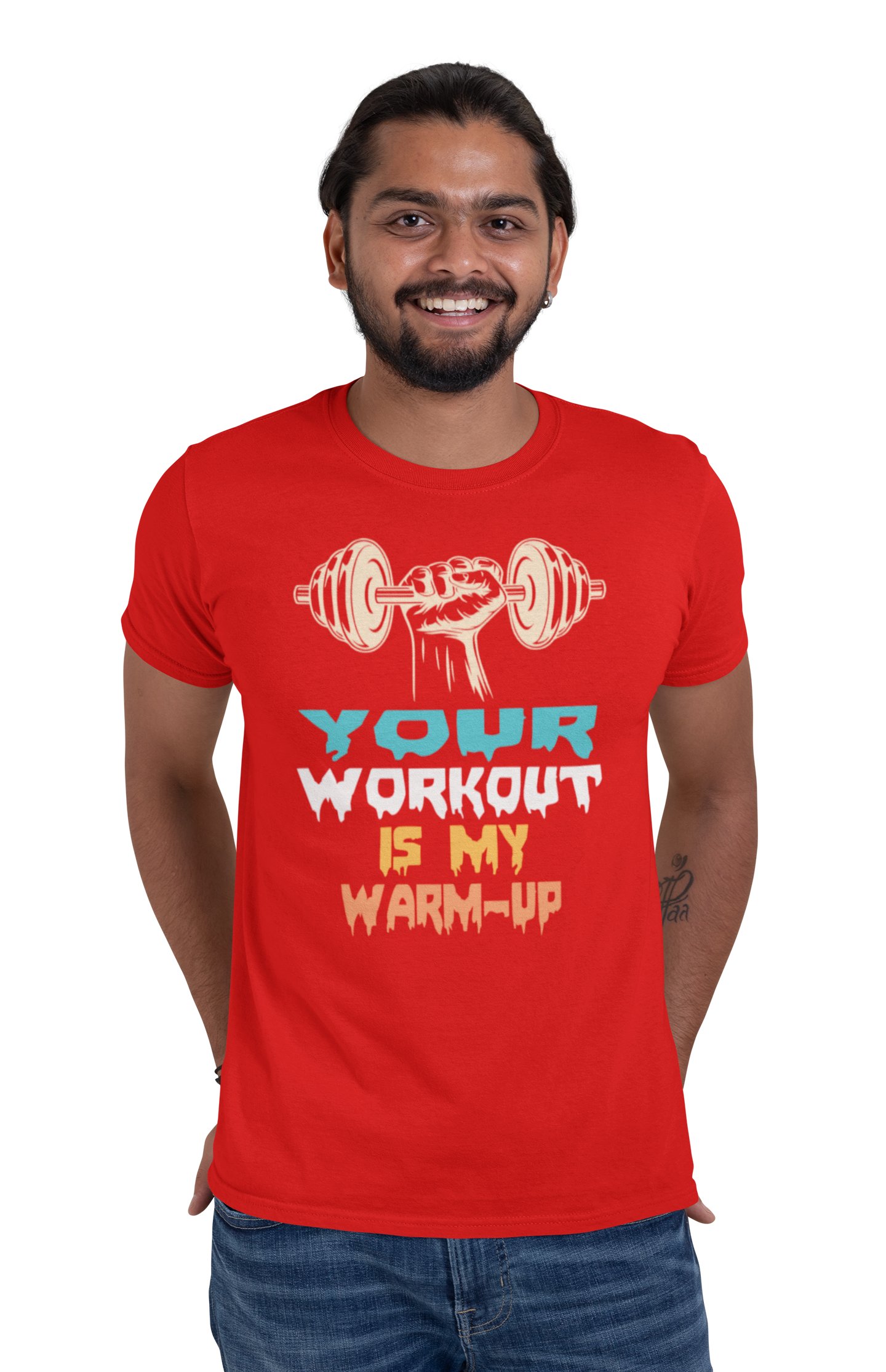 Your Workout Is My Warm-Up, (BG Blue, Yellow and Orange), Round Neck Gym Tshirt (Red Tshirt) - Clothes for Gym Lovers - Foremost Gifting Material for Your Friends and Close Ones