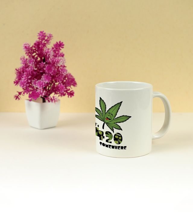 Start your day with a burst of vibrant energy! This printed coffee mug features a psychedelic leaf artwork surrounded by colorful flame-like patterns