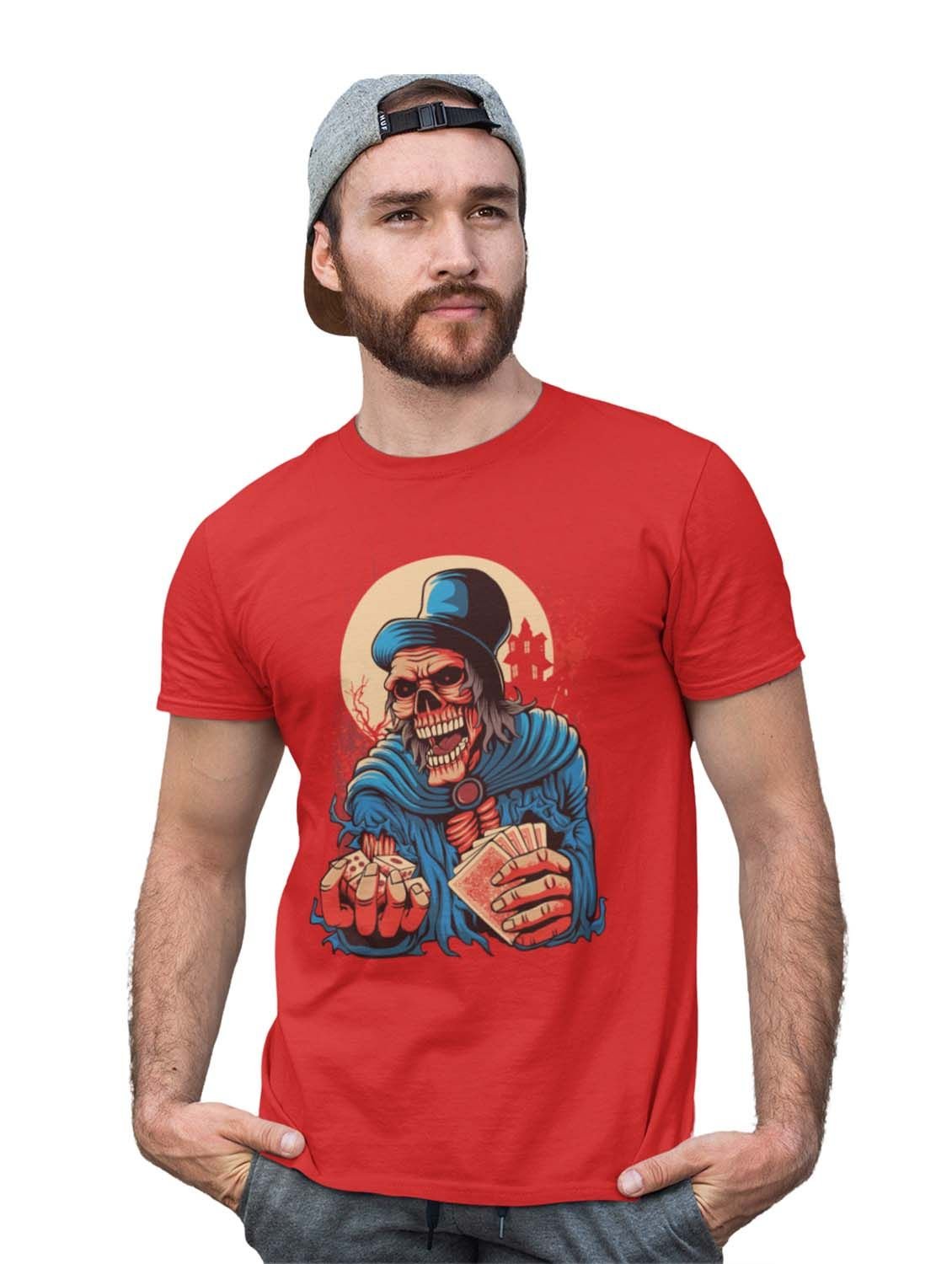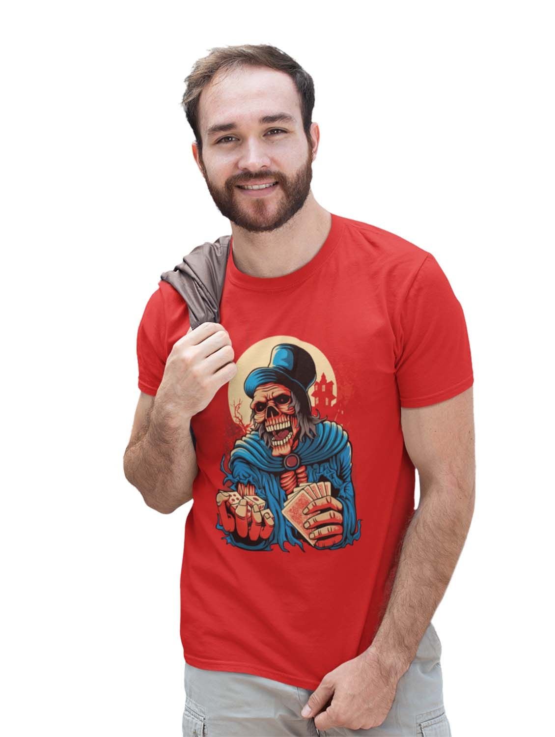 Cards Or Dices? Red Round Neck Cotton Half Sleeved T-Shirt with Printed Graphics