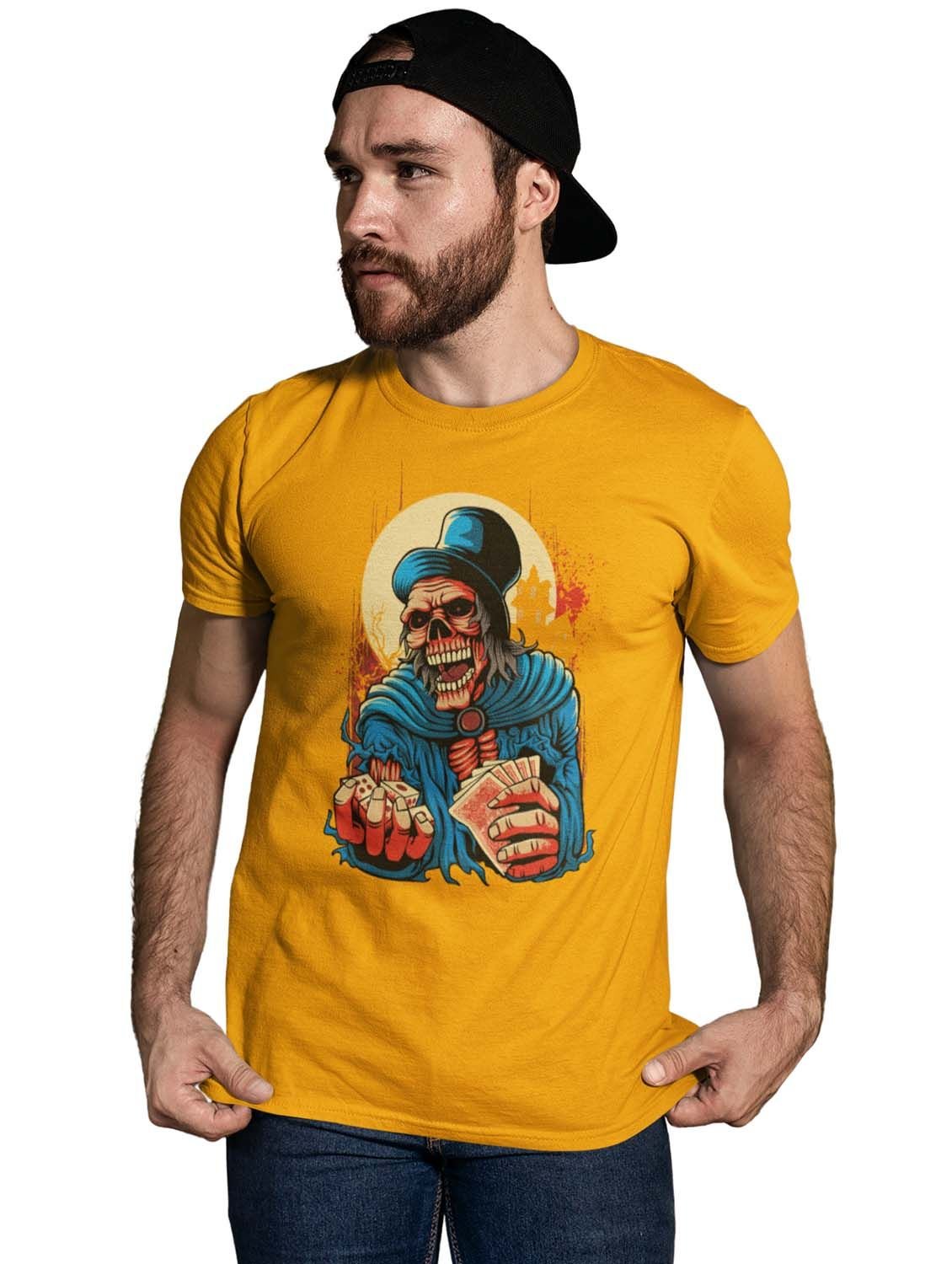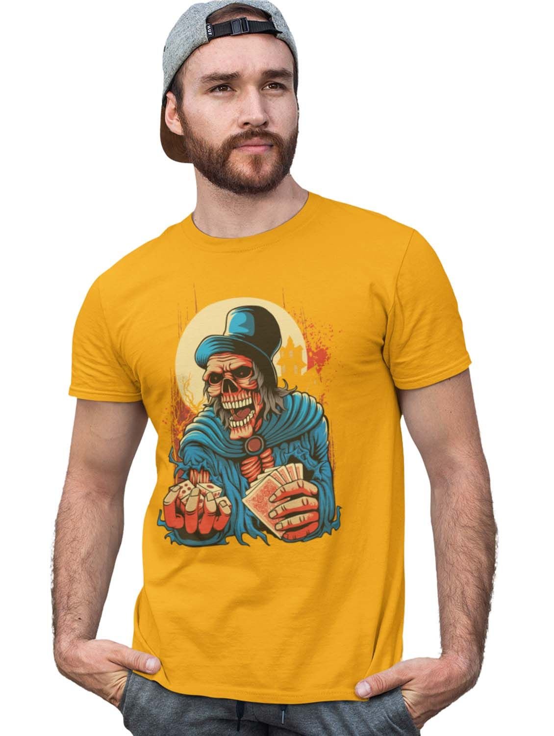 Cards Or Dices? Yellow Round Neck Cotton Half Sleeved T-Shirt with Printed Graphics