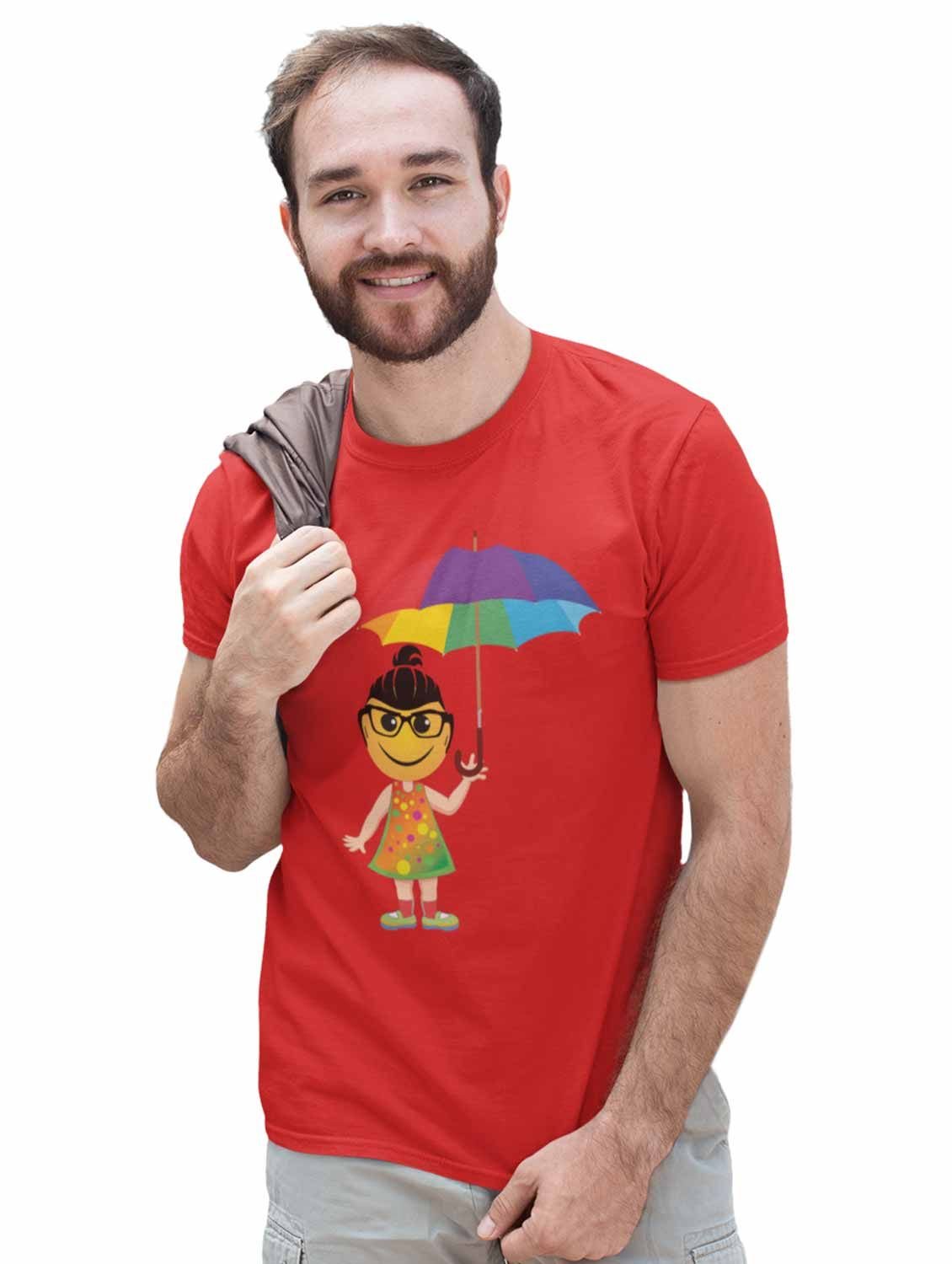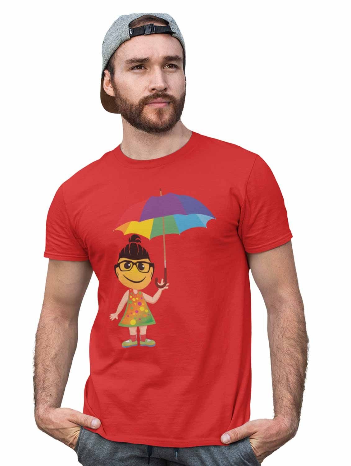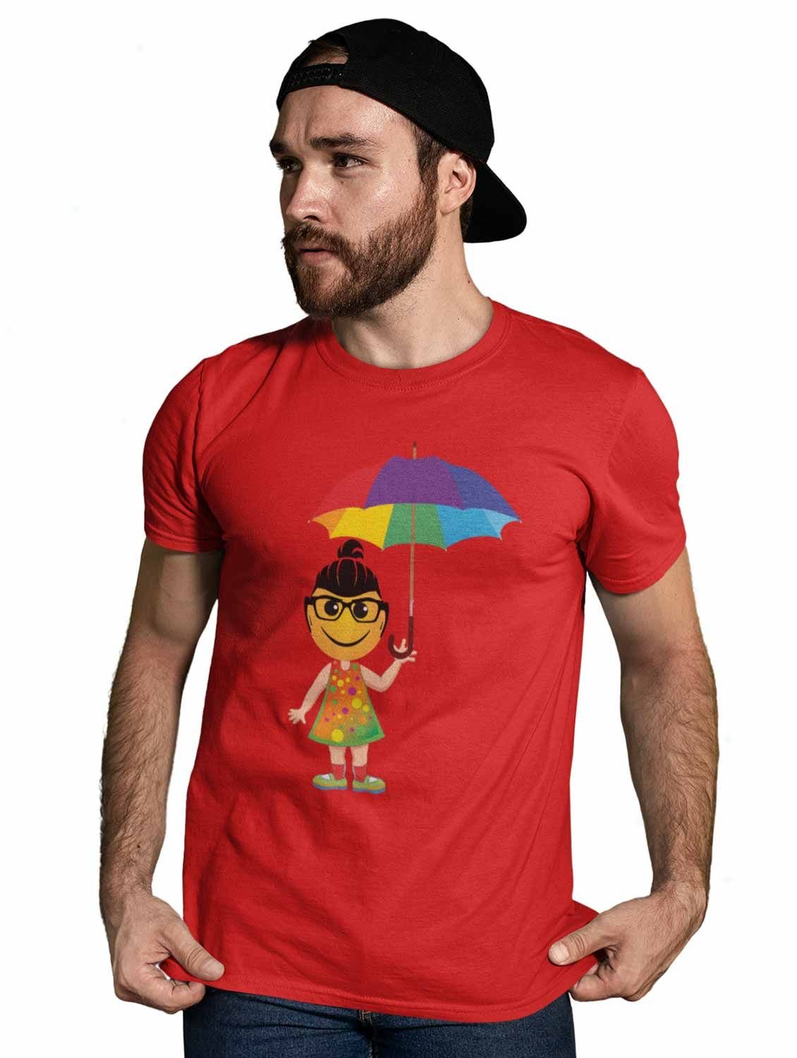 A Young Emoji Girl with Umbrella Printed T-shirt (Red) - Clothes for Emoji Lovers - Suitable for Fun Events- Foremost Gifting Material for Your Friends and Close Ones