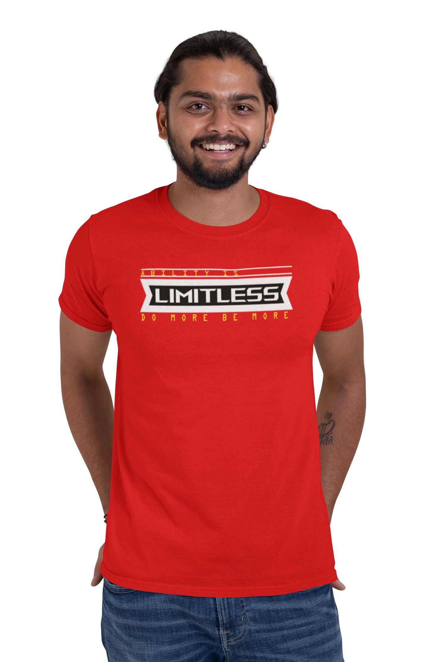Ability Is Limitless, Do More, Be More, (BG Blue and Yellow), Round Neck Gym Tshirt (Red Tshirt) - Foremost Gifting Material for Your Friends and Close Ones