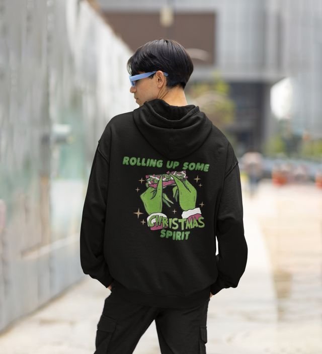 Actively Rolling Up Christmas Items in Joyful Preparation for the Holiday Season Printed Black Cotton Hoodie