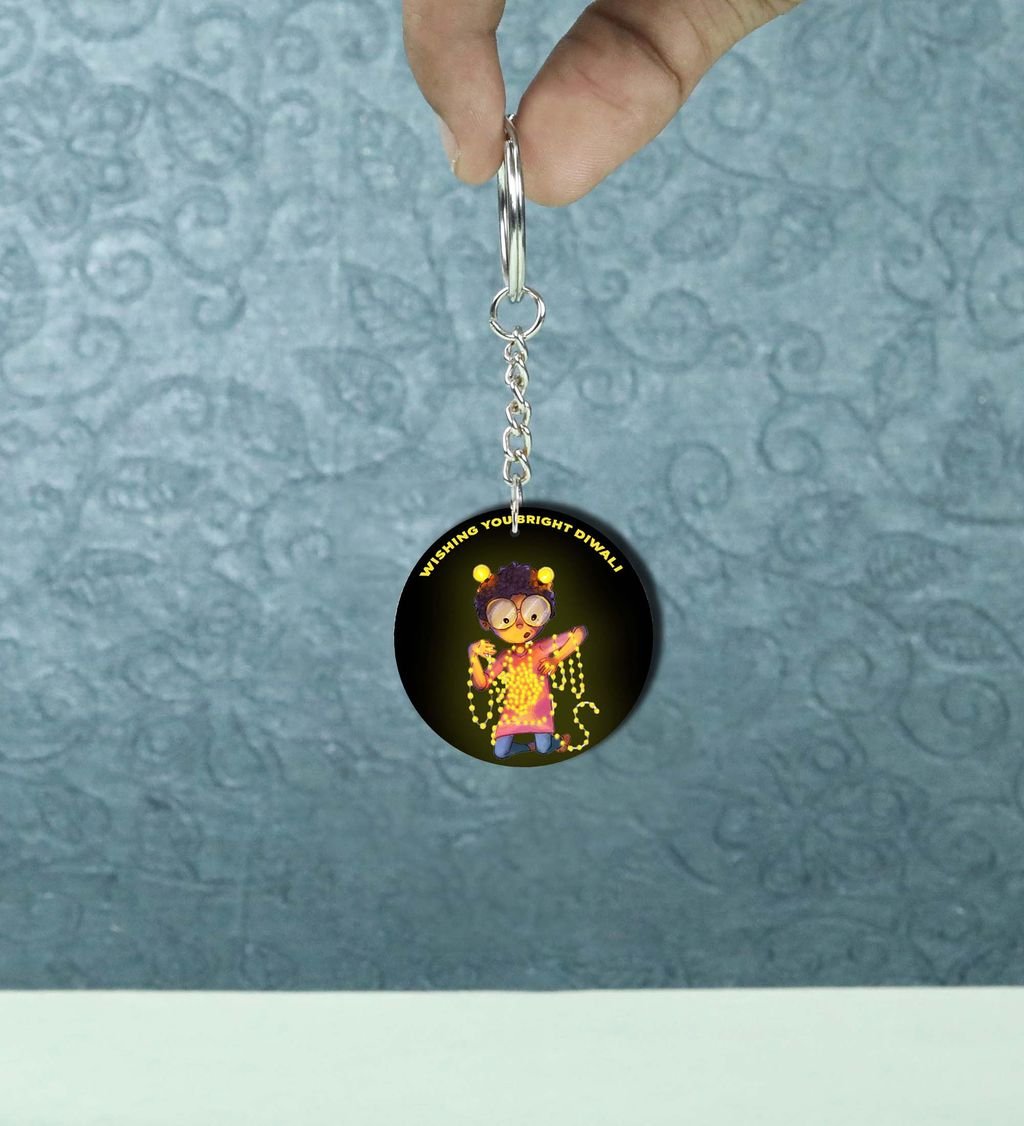 Adorable Character Glowing with Diwali Lights Design Printed Round Keychain Pack of 2