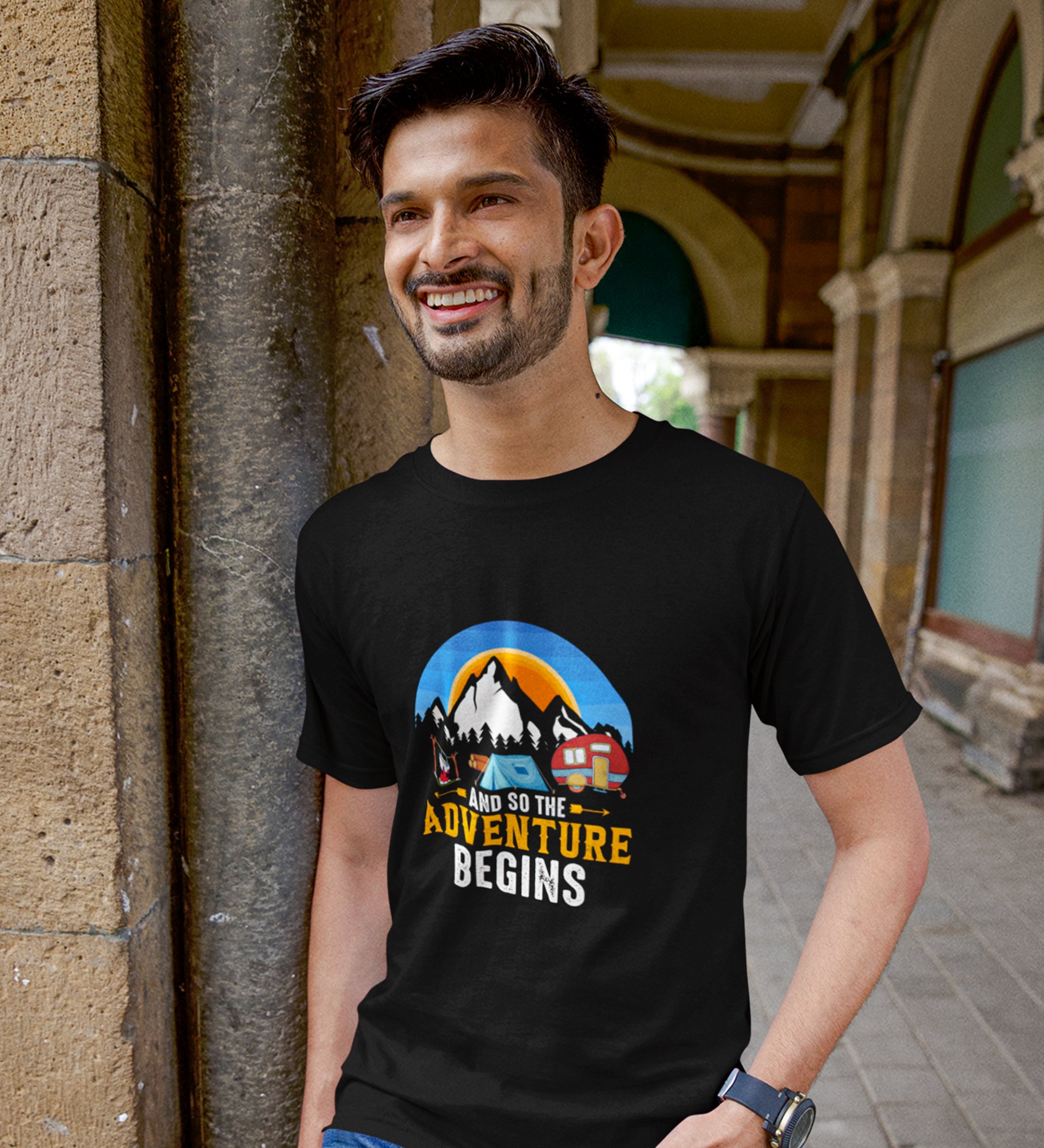 JD.TRENDS Adventure Begins Black Round Neck Cotton Half Sleeved Men's T-Shirt with Printed Graphics