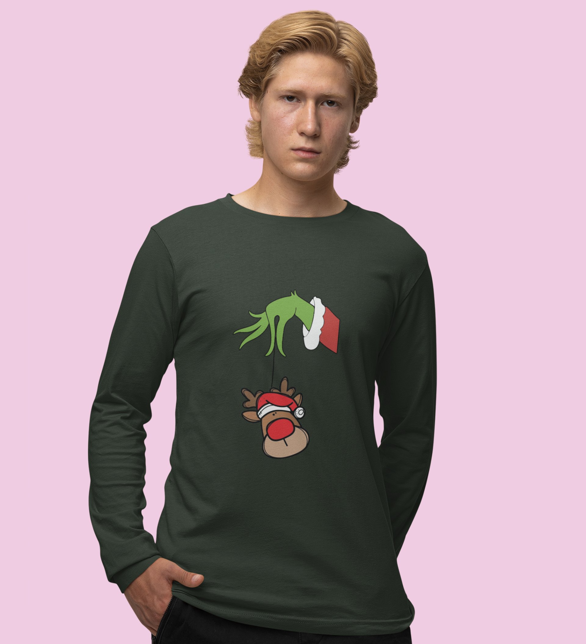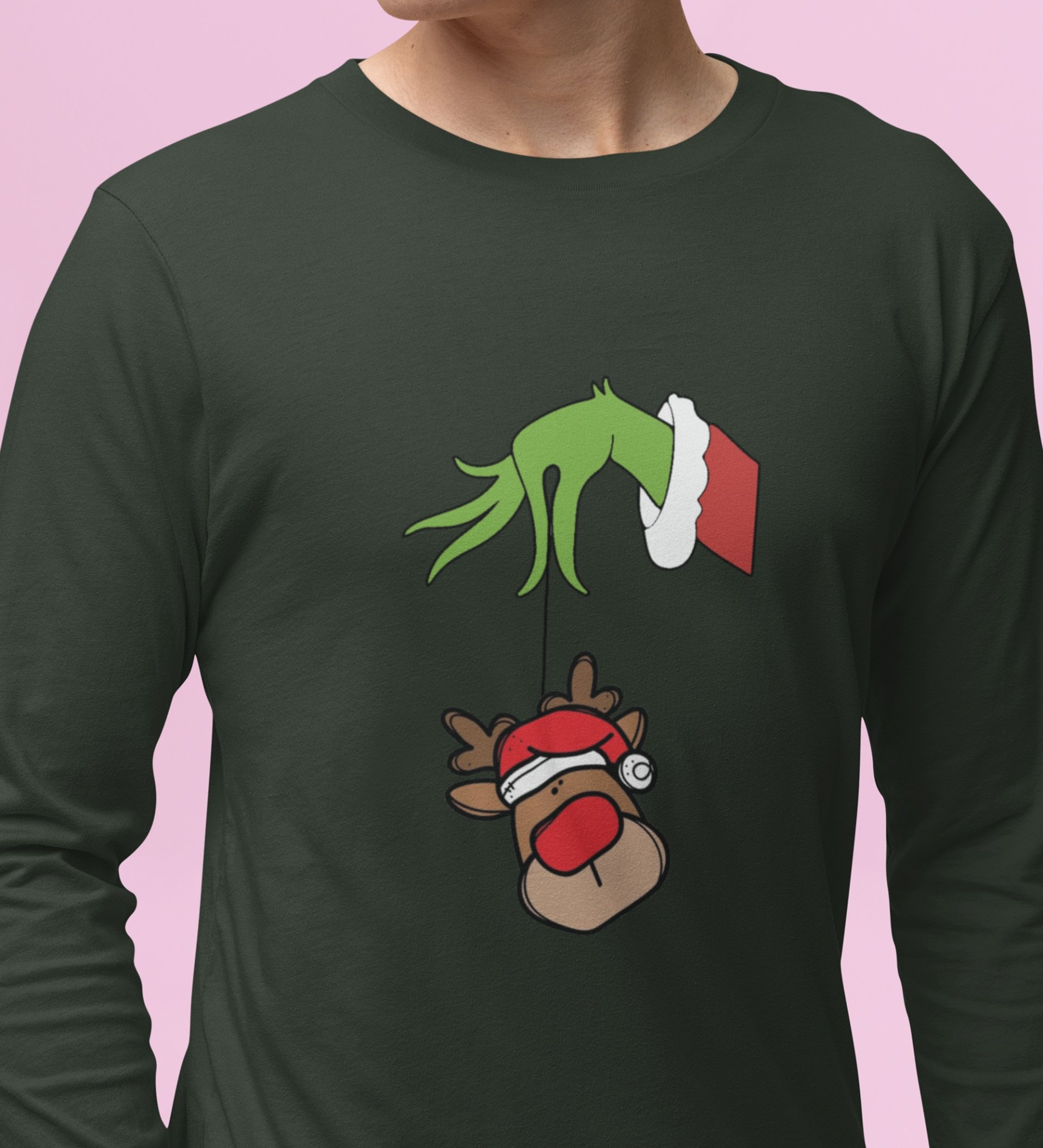 Alien & Reindeer: Green Christmas Edition PrintedFull Sleeve T-shirt - Ideal for Spreading Holiday Cheer at Gym, Yoga, and Outdoor Activities