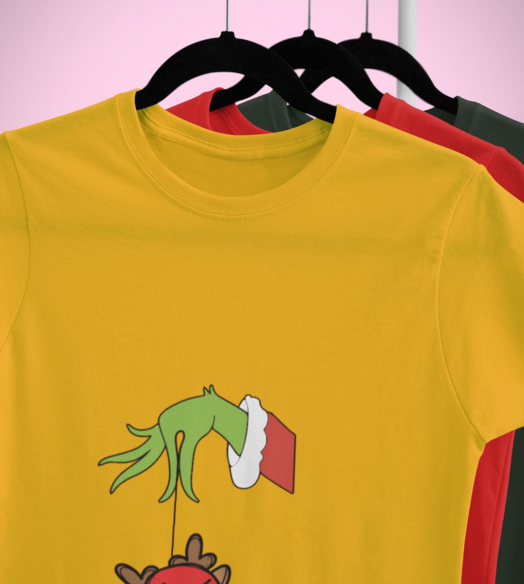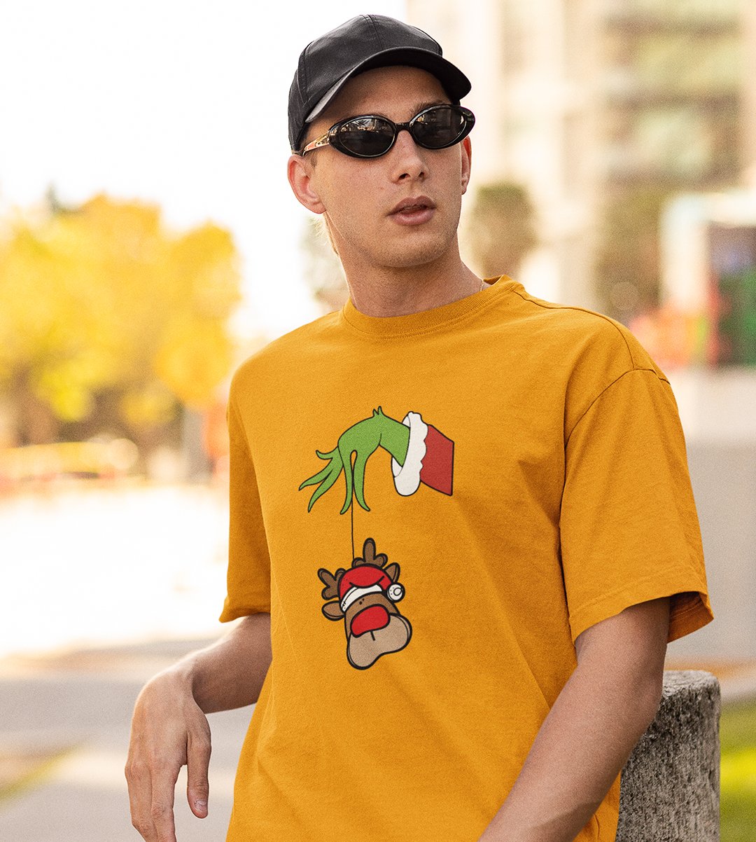Alien & Reindeer:(Yellow) Christmas Edition Printed T-shirt - Ideal for Spreading Holiday Cheer at Gym, Yoga, and Outdoor Activities