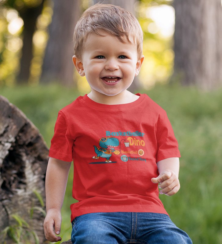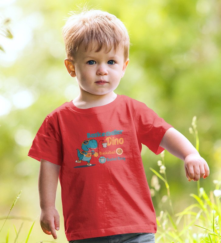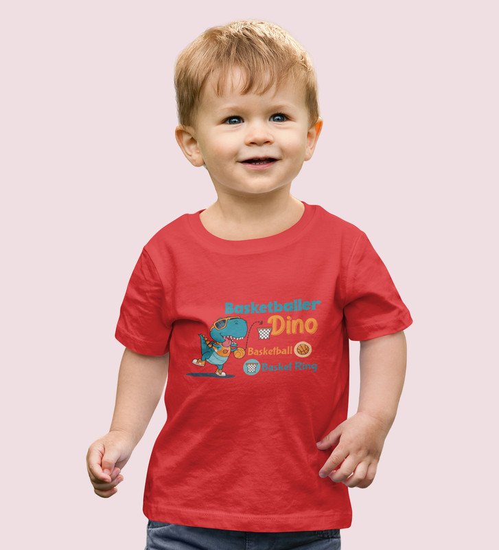Basketballer Dino, Printed Cotton T-shirt (Red) for Boys