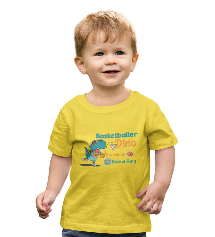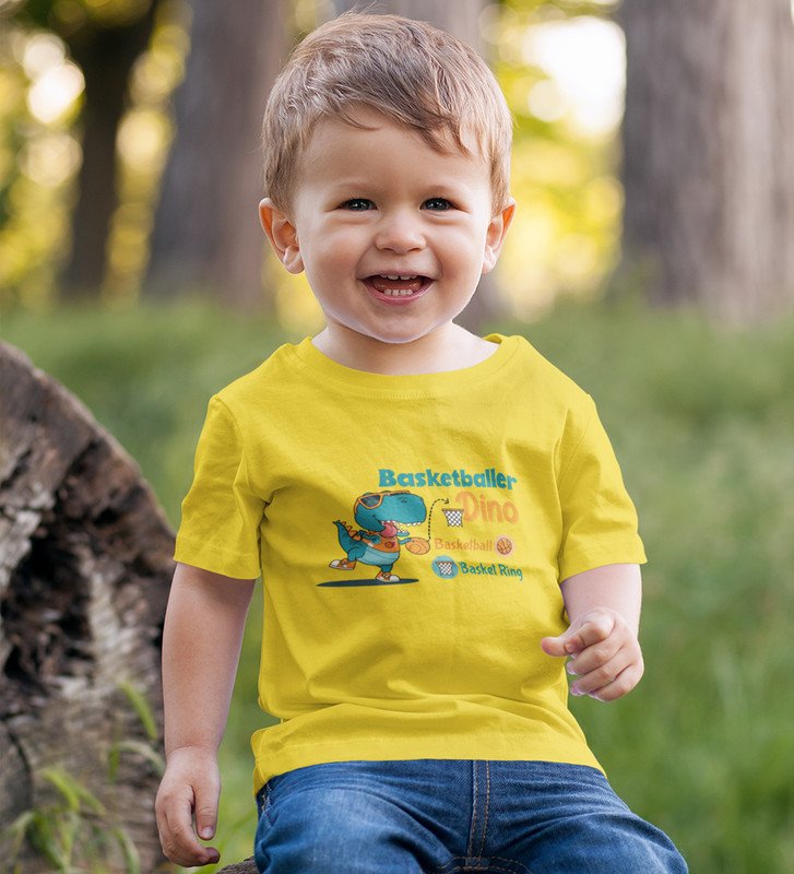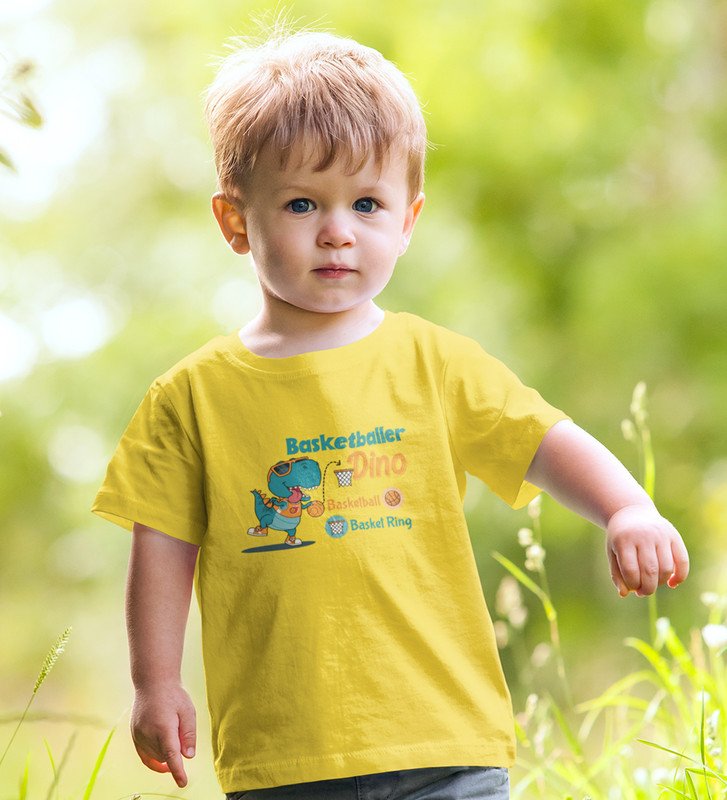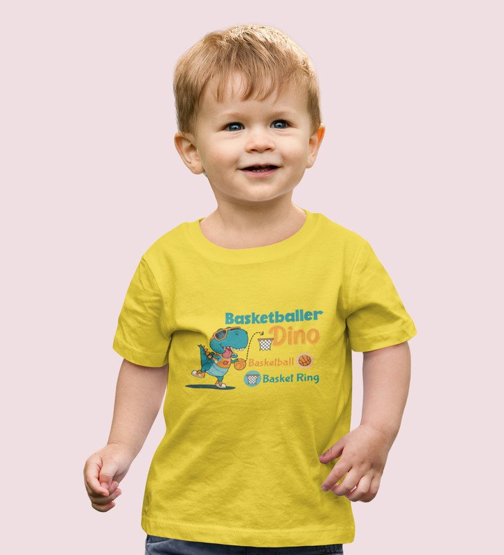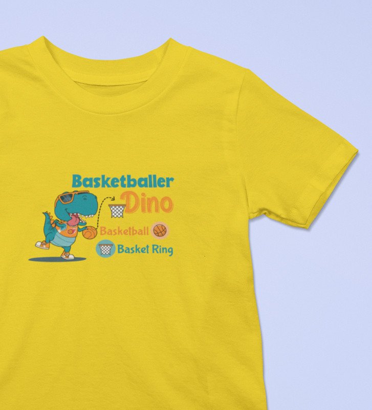 Basketballer Dino, Printed Cotton Tshirt (Yellow) for Boys