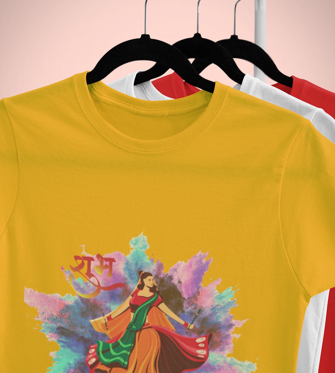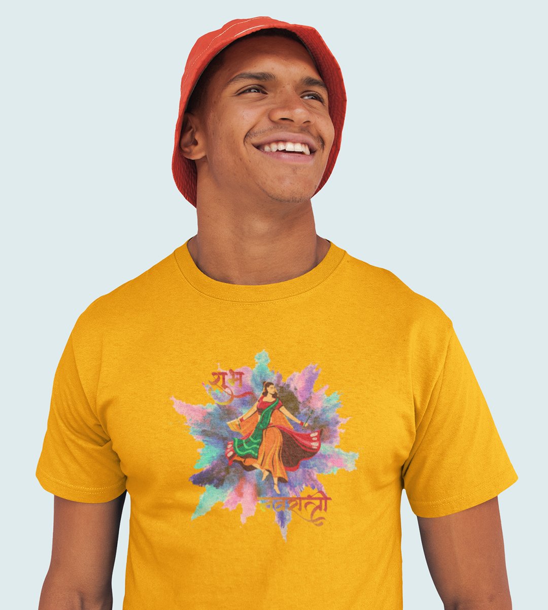 Navratri is a very auspicious festival for hindus. It takes place at the beginning of October and sometimes September. Enjoy the 9 days of festivities with full zeal and make yourself submerged in the love of Maa Durga. Navratri is also known as Durga Puja. And with this Tees, you can shine like a star during this festive season with our navratri themed cotton half sleeved Tshirts. You can pair our t-shirts with trousers and denim of your choice and make it a weekday smart casual or weekend wear. This is durable. This tshirt is smooth and soft which makes you comfortable to wear during all seasons. The printing in it is durable and odourless. It has five sizes, S,M,L,XL,XXL. The Tshirt colour is intact even after repeated washes. It can be kept in your wardrobe and hangers. Please avoid washing mashine to clean this Tee, it may affect the print. Hand wash only. We have brought you many navratri related designs printed on our different colour Tshirts to choose from. Grab it now.