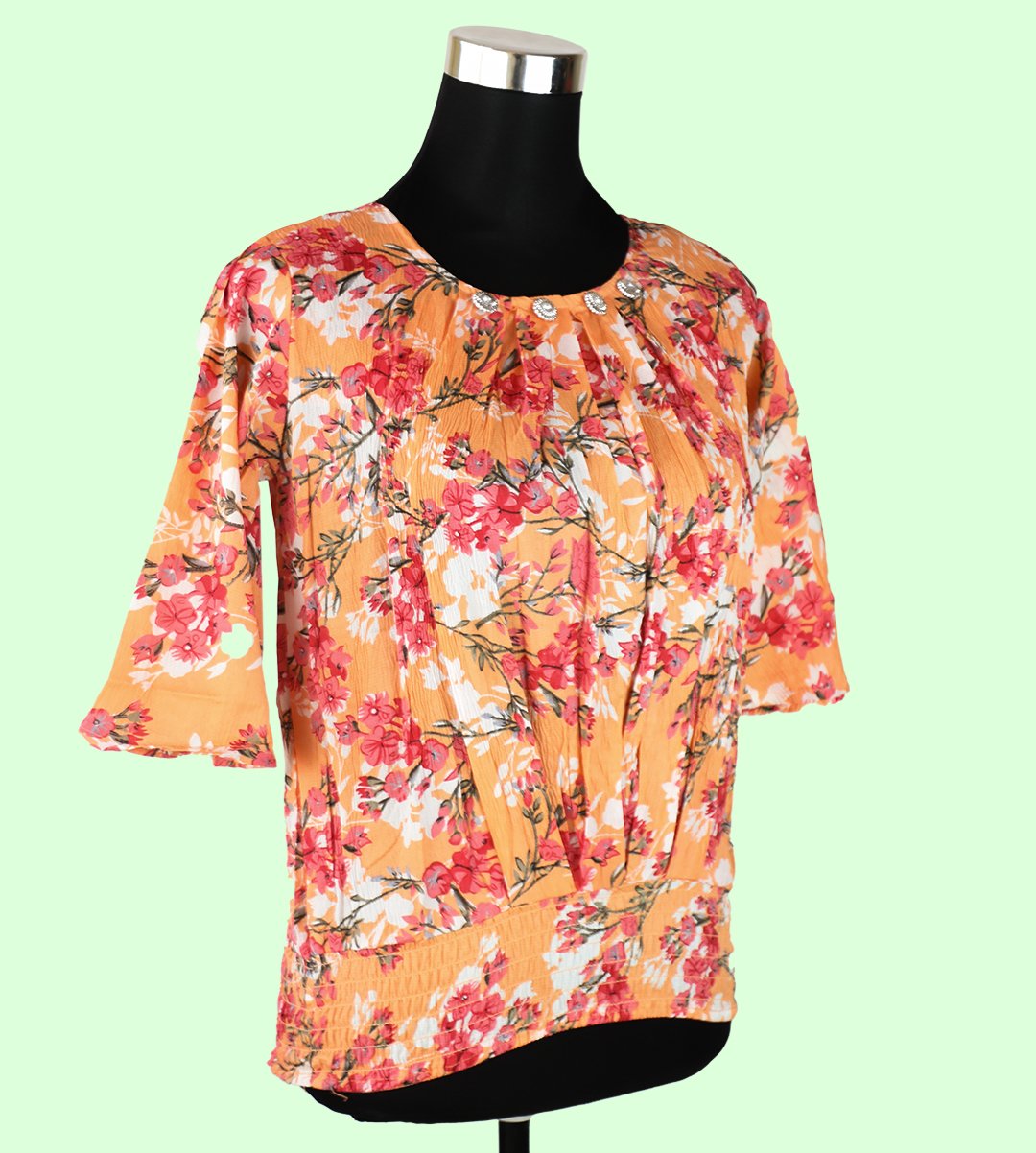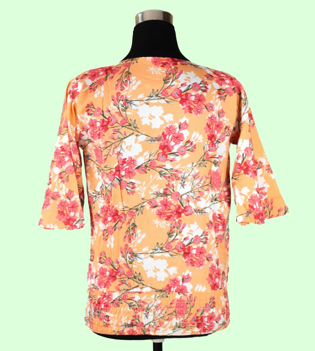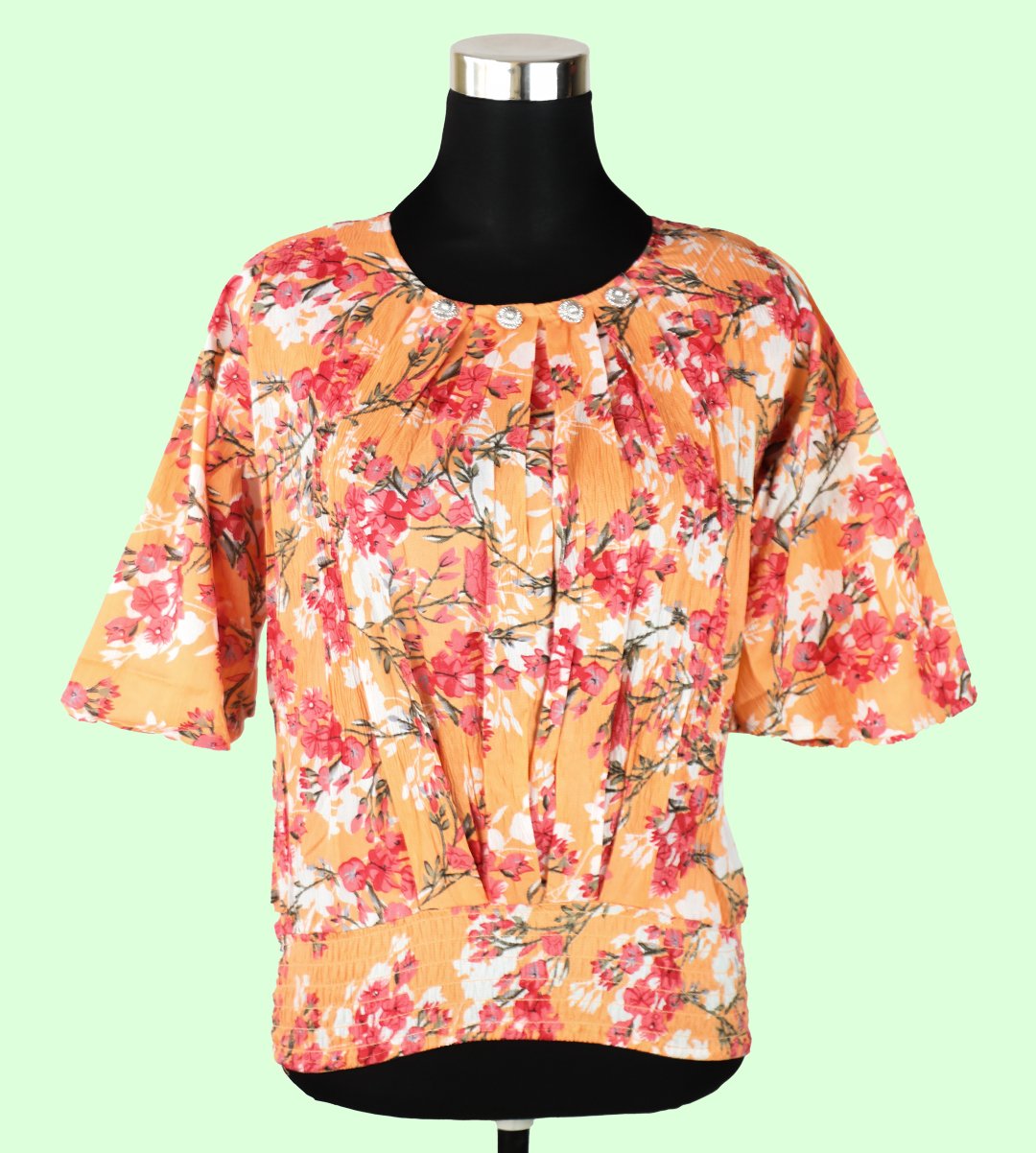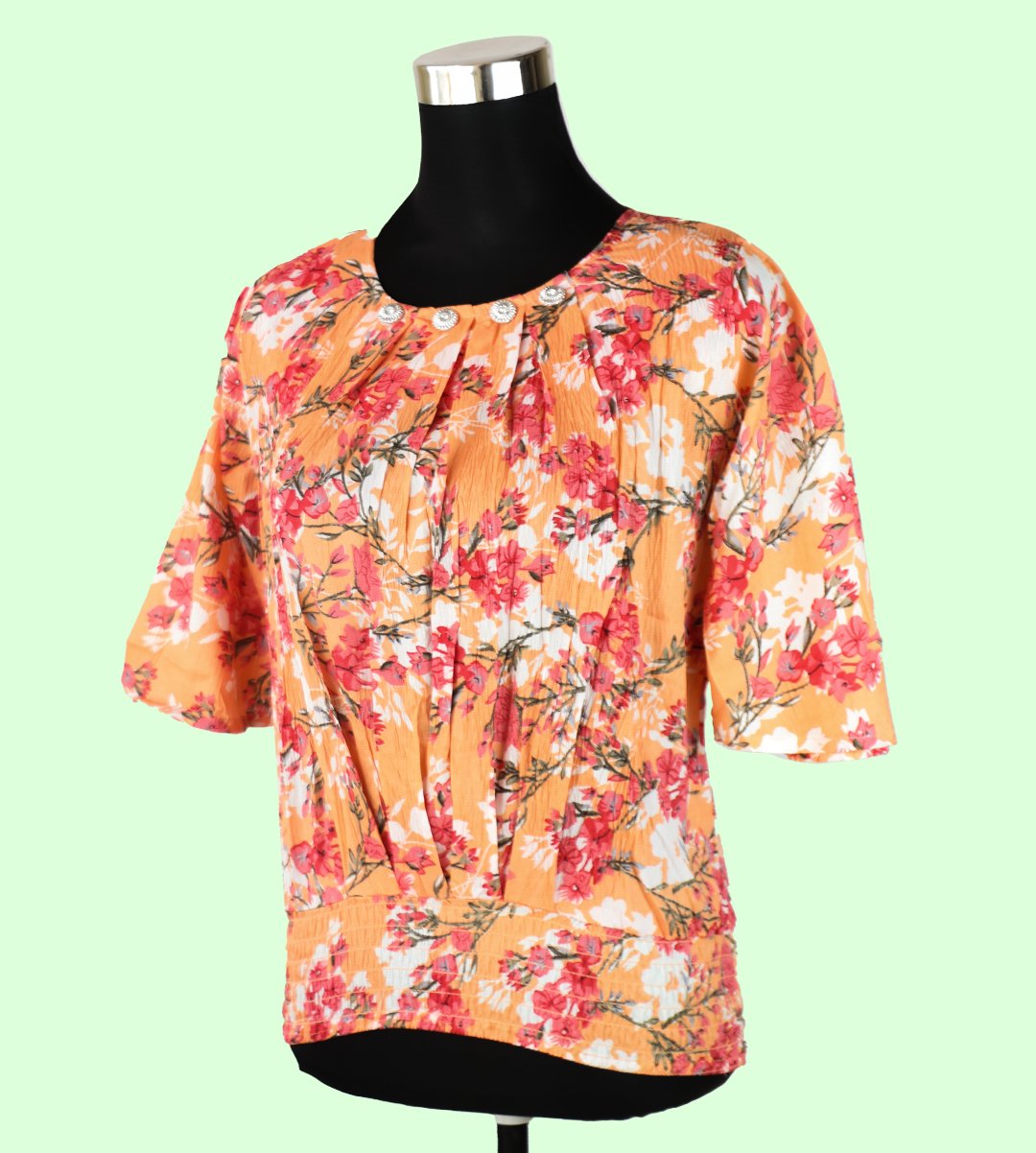 Elevate your wardrobe with our Women's Orange Top adorned with a stunning Red Floral Print, a vibrant and elegant addition to your style. This top showcases a classic round neck design and offers a regular fit, making it suitable for various occasions. Crafted from soft Rayon fabric, it combines style and breathability. The captivating Red Floral Print adds a touch of vibrancy and timeless elegance to your look.