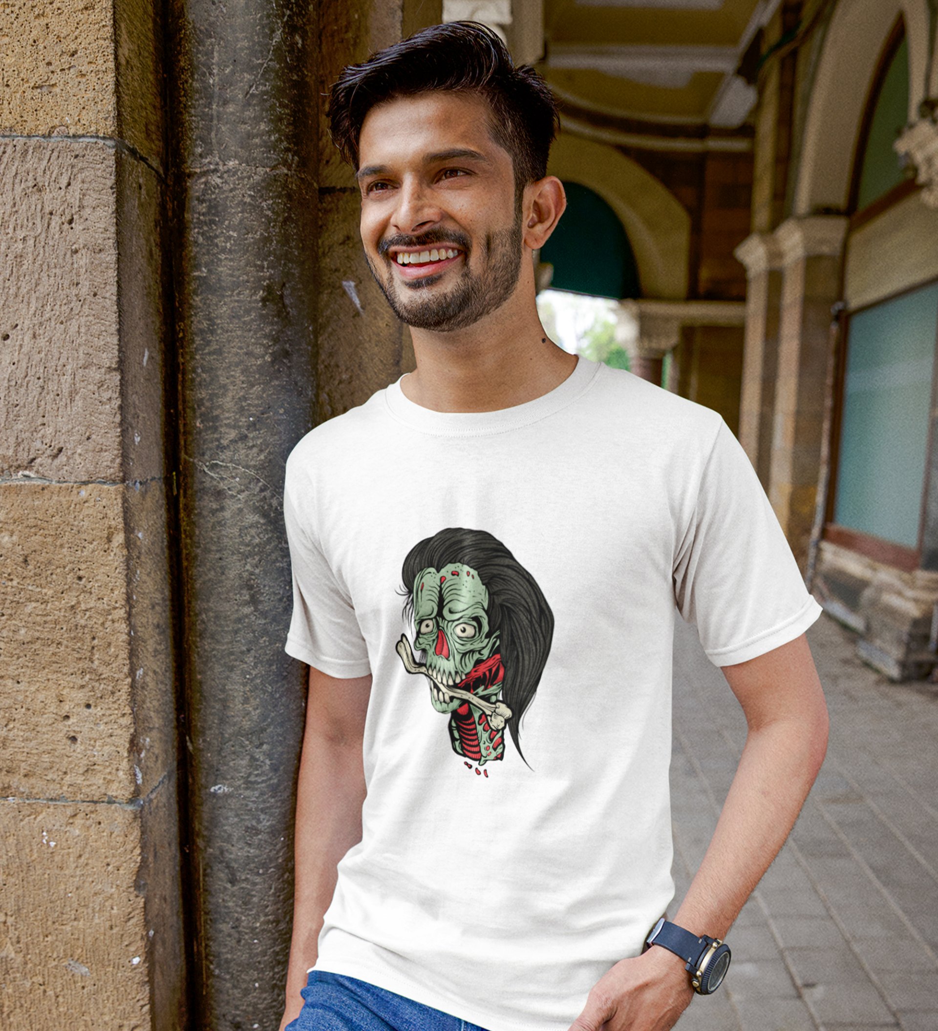 Bone Monster White Round Neck Cotton Half Sleeved Men's T-Shirt with Printed Graphics