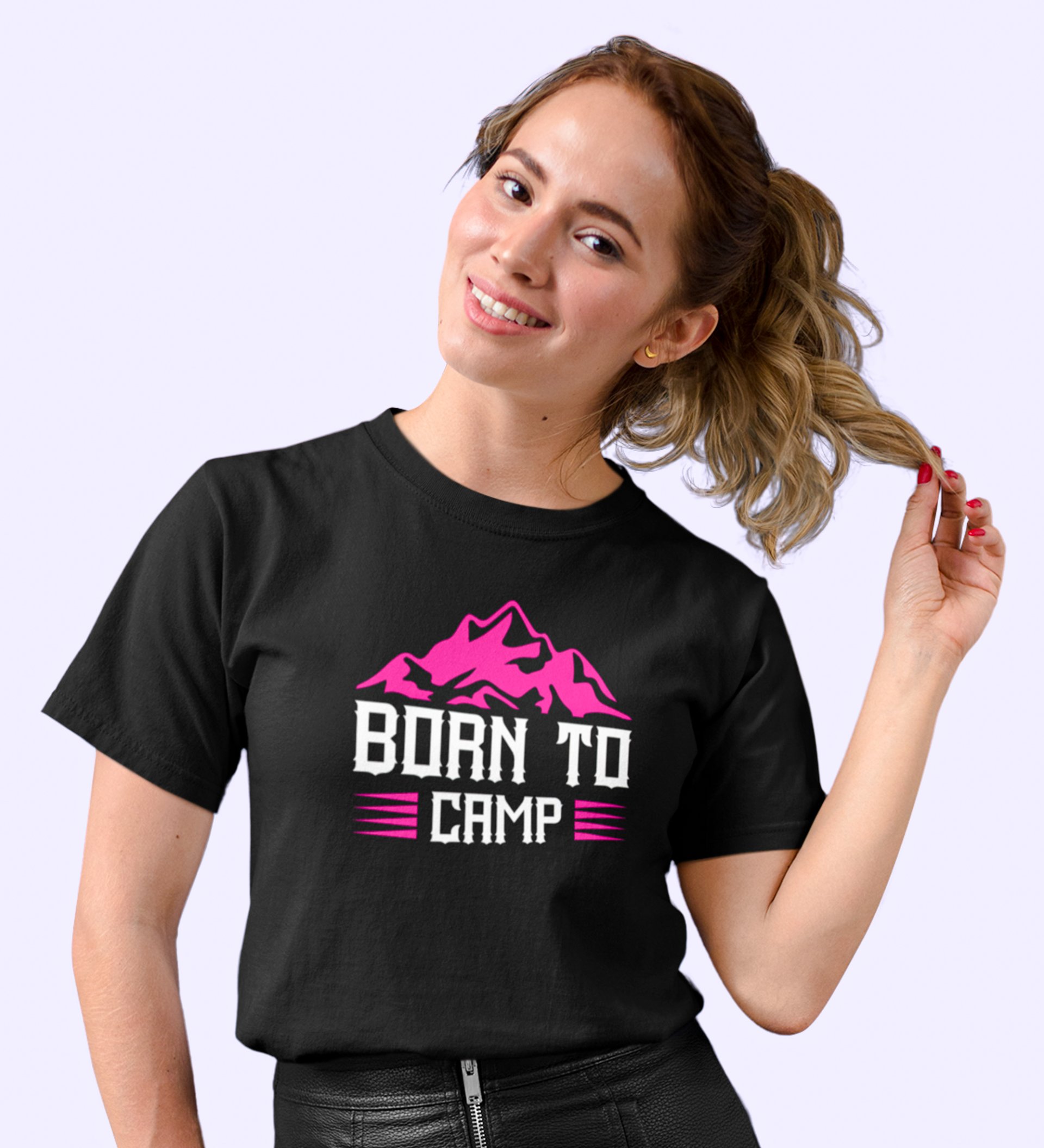 HopOfferBorn To Camp Black Round Neck Cotton Half Sleeved Women's T-Shirt with Printed Graphics