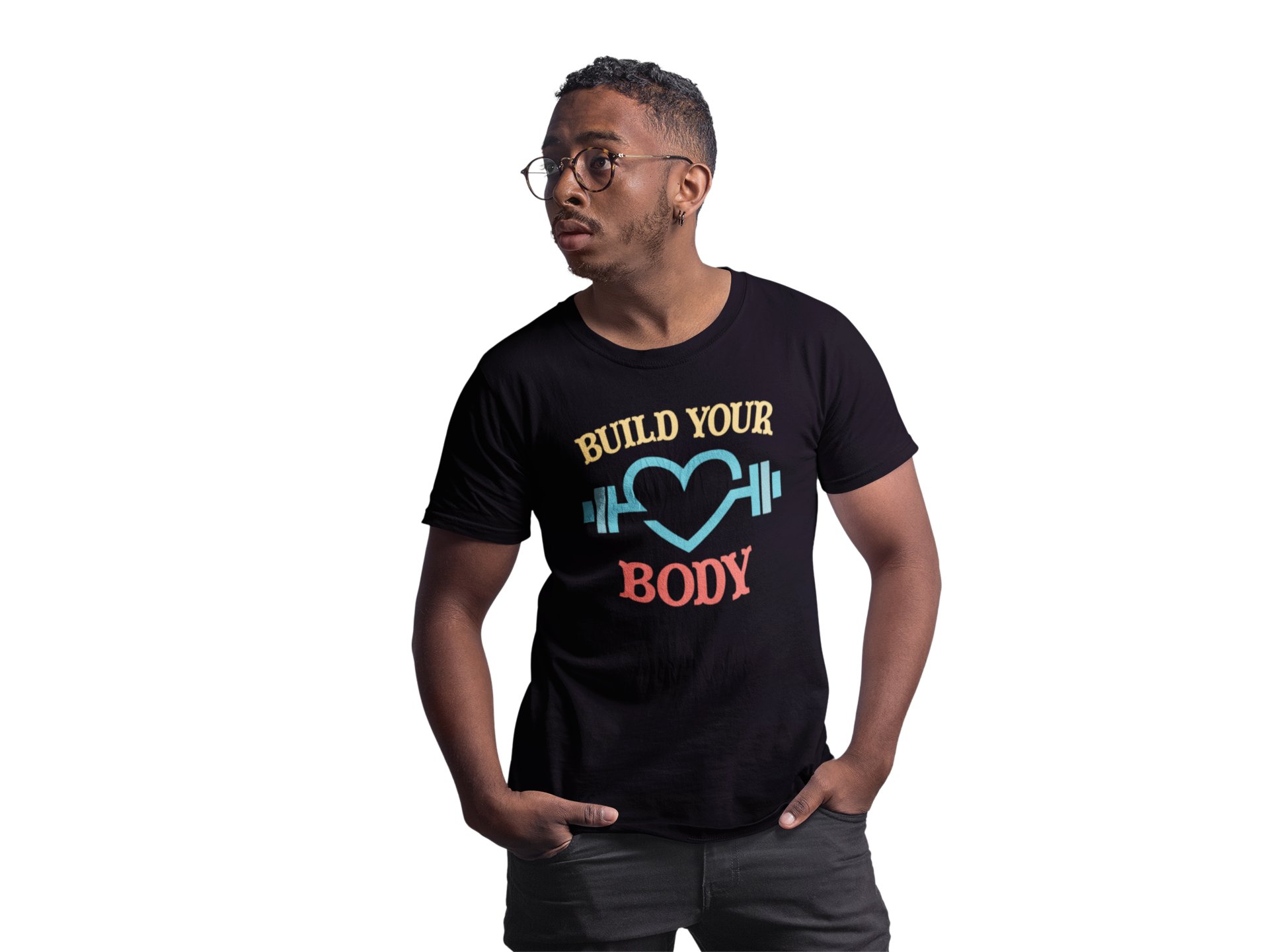 Build Your Body, (BG Blue, Yellow and Orange), Round Neck Gym Tshirt (White Tshirt) - Clothes for Gym Lovers - Suitable for Gym Going Person - Foremost Gifting Material for Your Friends and Close Ones