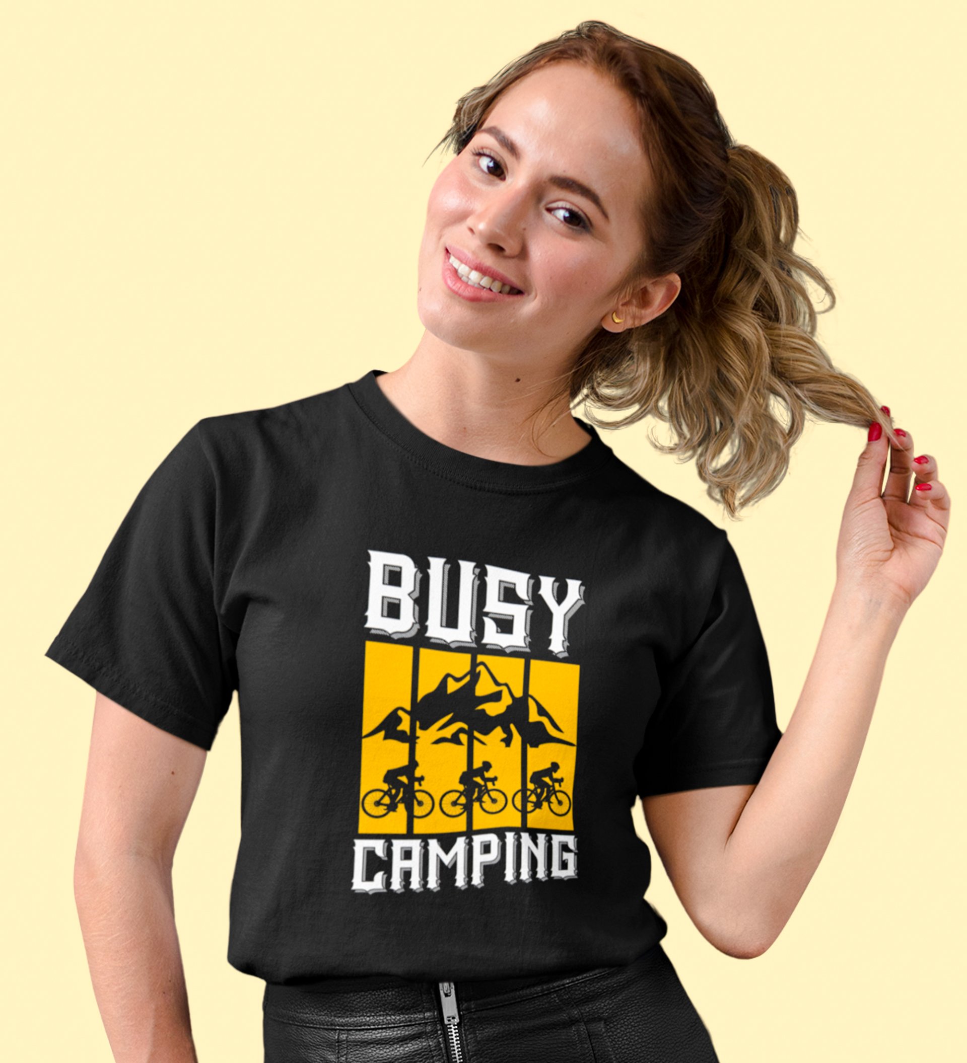 HopOfferBusy Camping Black Round Neck Cotton Half Sleeved Women's T-Shirt with Printed Graphics