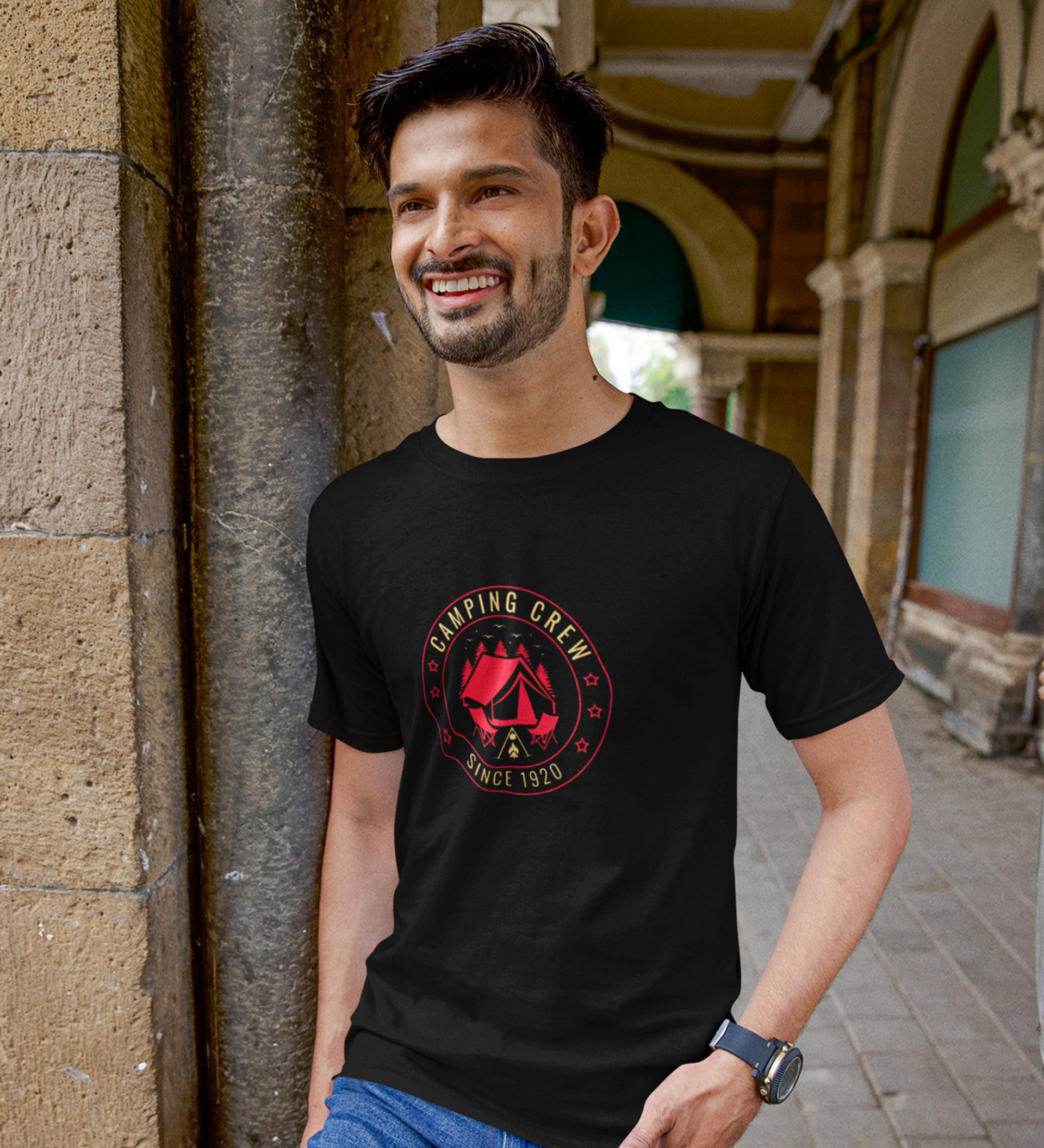 JD.TRENDS The Camping Crew Black Round Neck Cotton Half Sleeved Men's T-Shirt with Printed Graphics