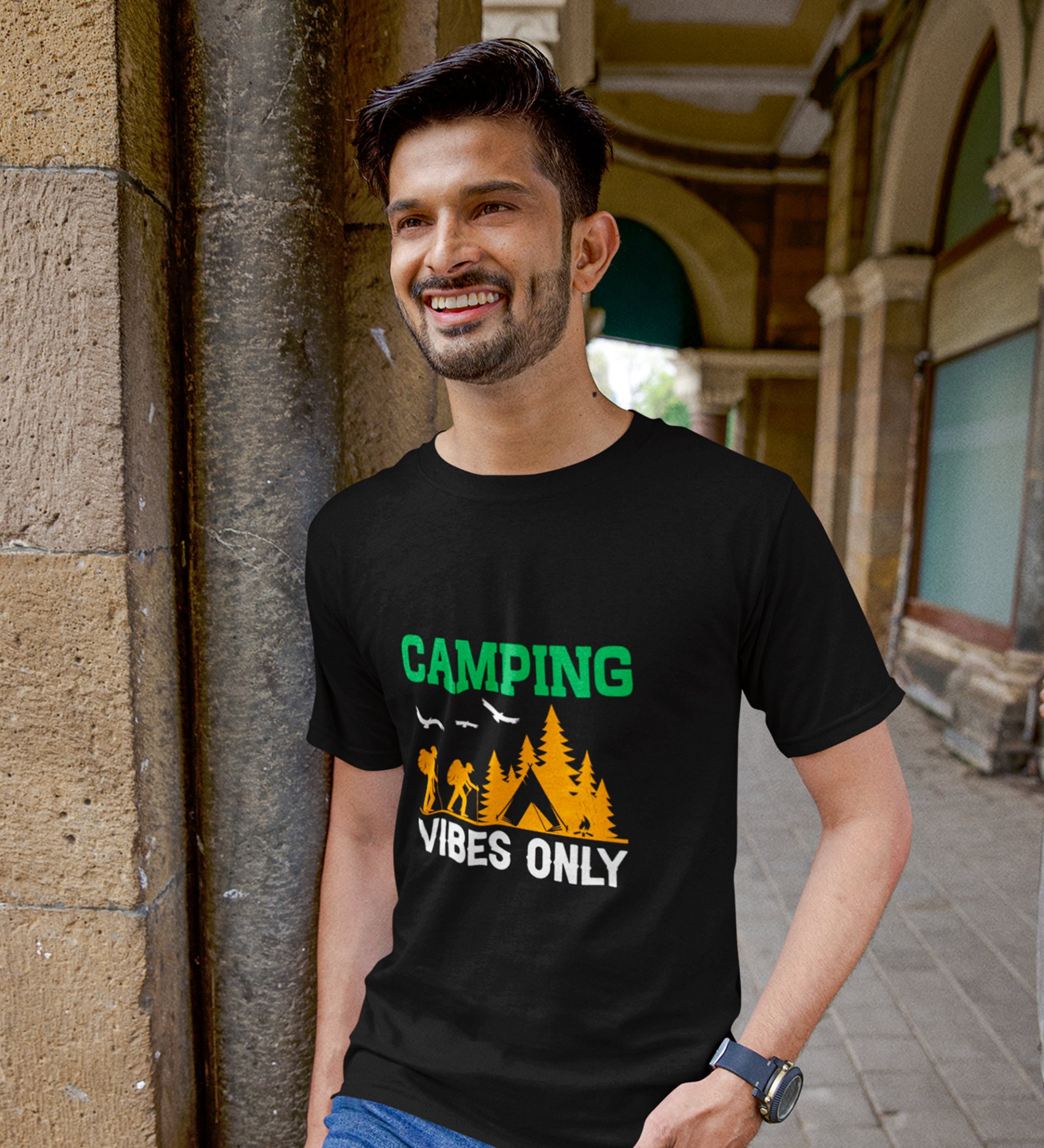 JD.TRENDS Camping Vibes Only Black Round Neck Cotton Half Sleeved Men's T-Shirt with Printed Graphics