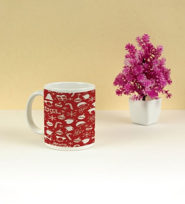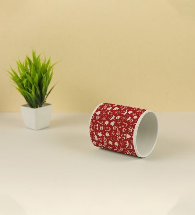 Cheerful Festive Symbols on Red Christmas Wrapping Full Printed Coffee Mug