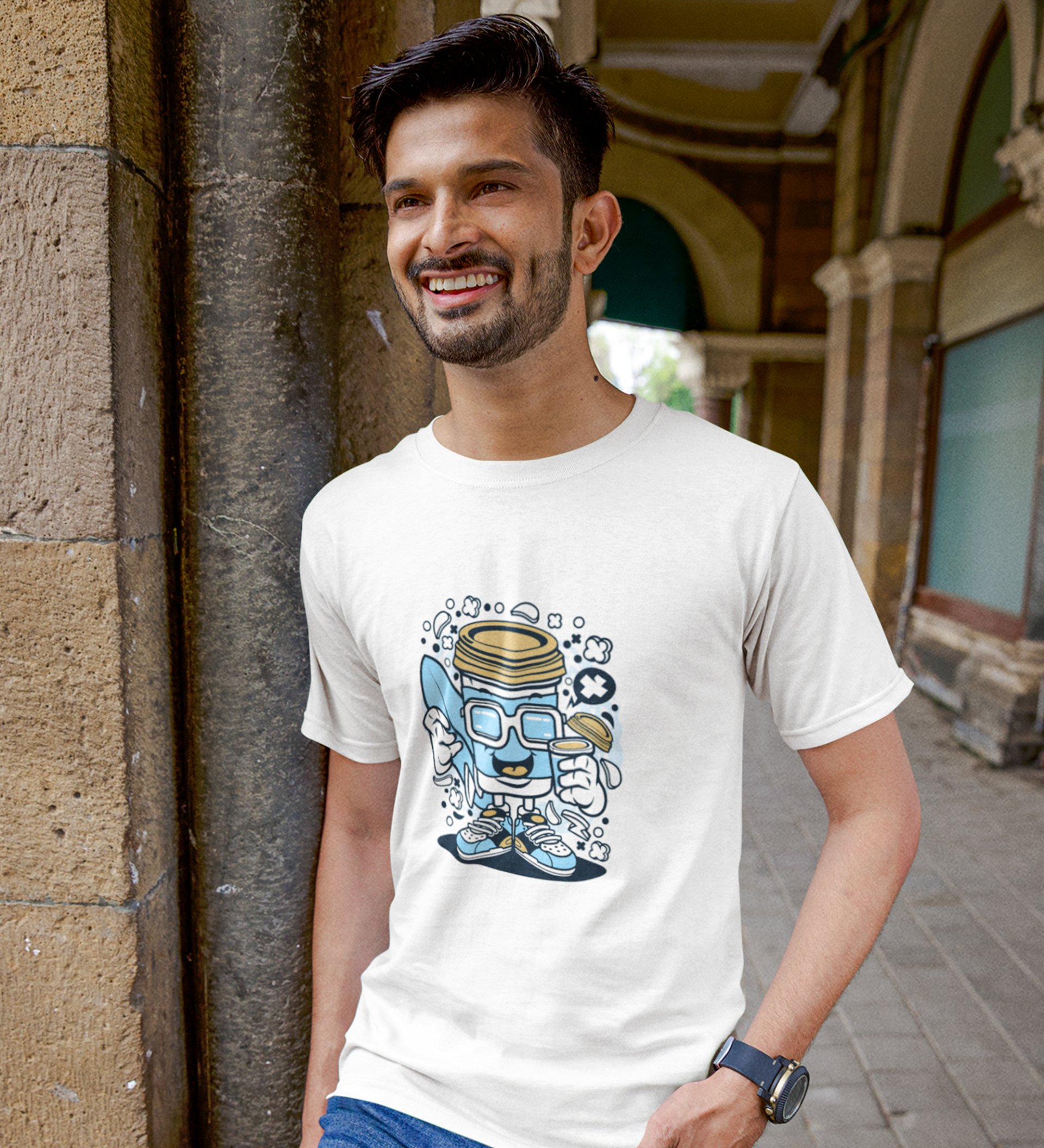 Cool Coffee Container White Round Neck Cotton Half Sleeved Men's T-Shirt with Printed Graphics