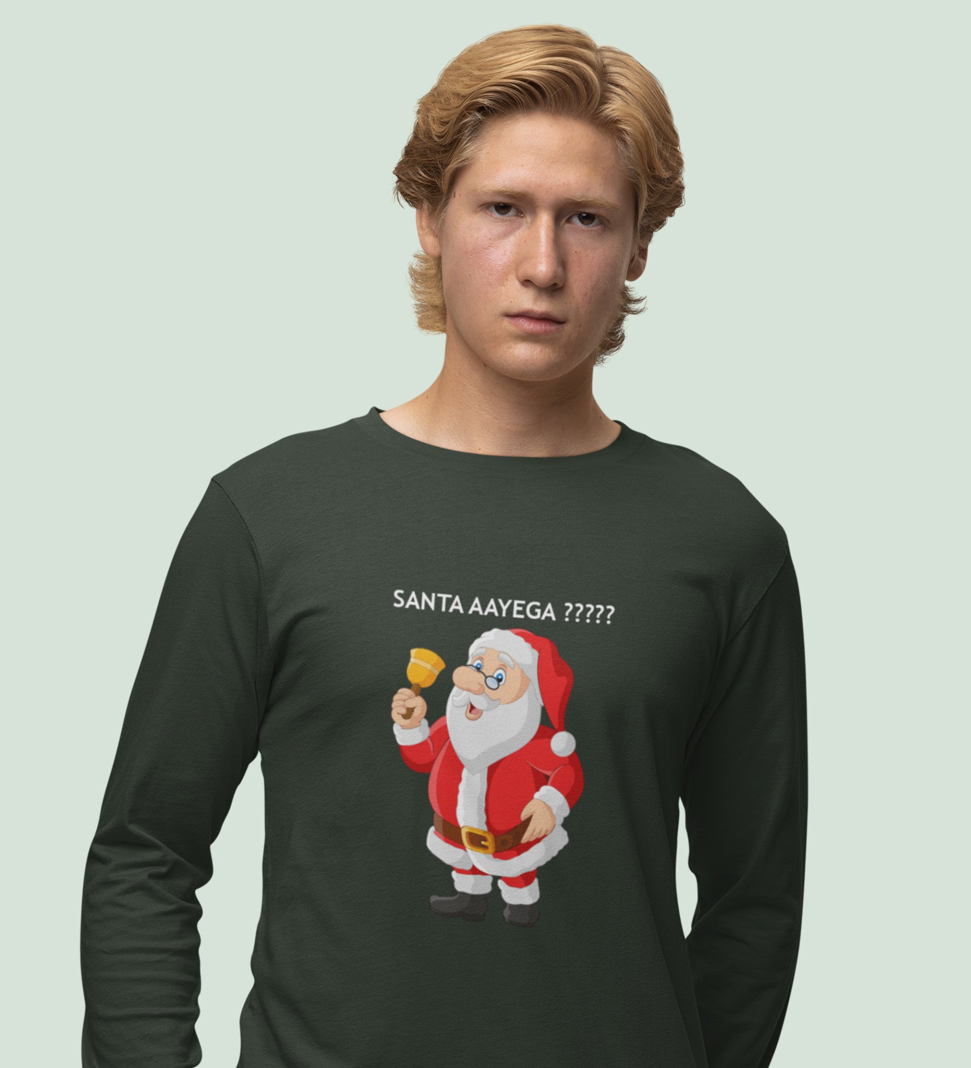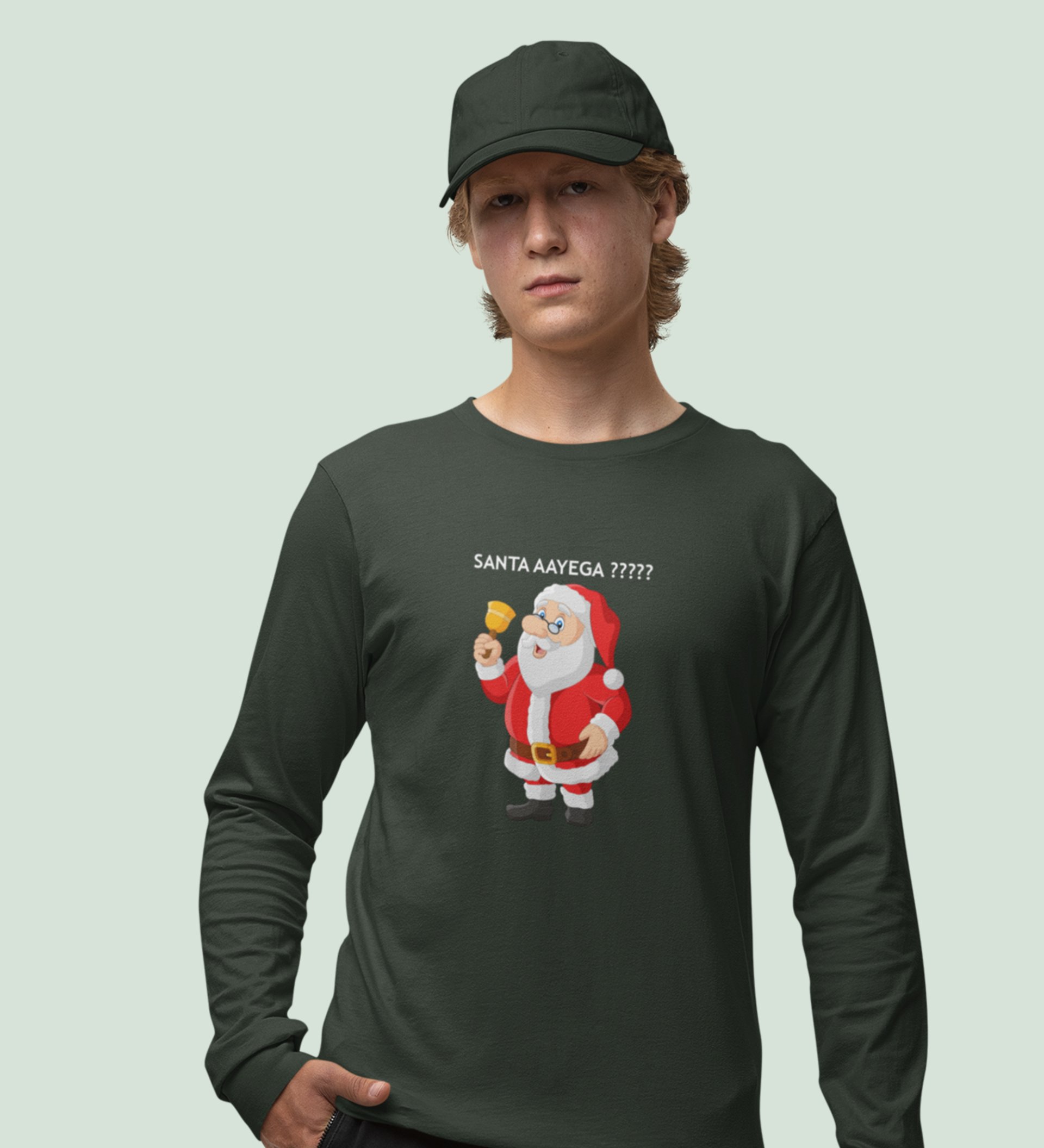 Curious Santa: Cute DesignerFull Sleeve T-shirt Green Best Gift For Kids Boys Girls