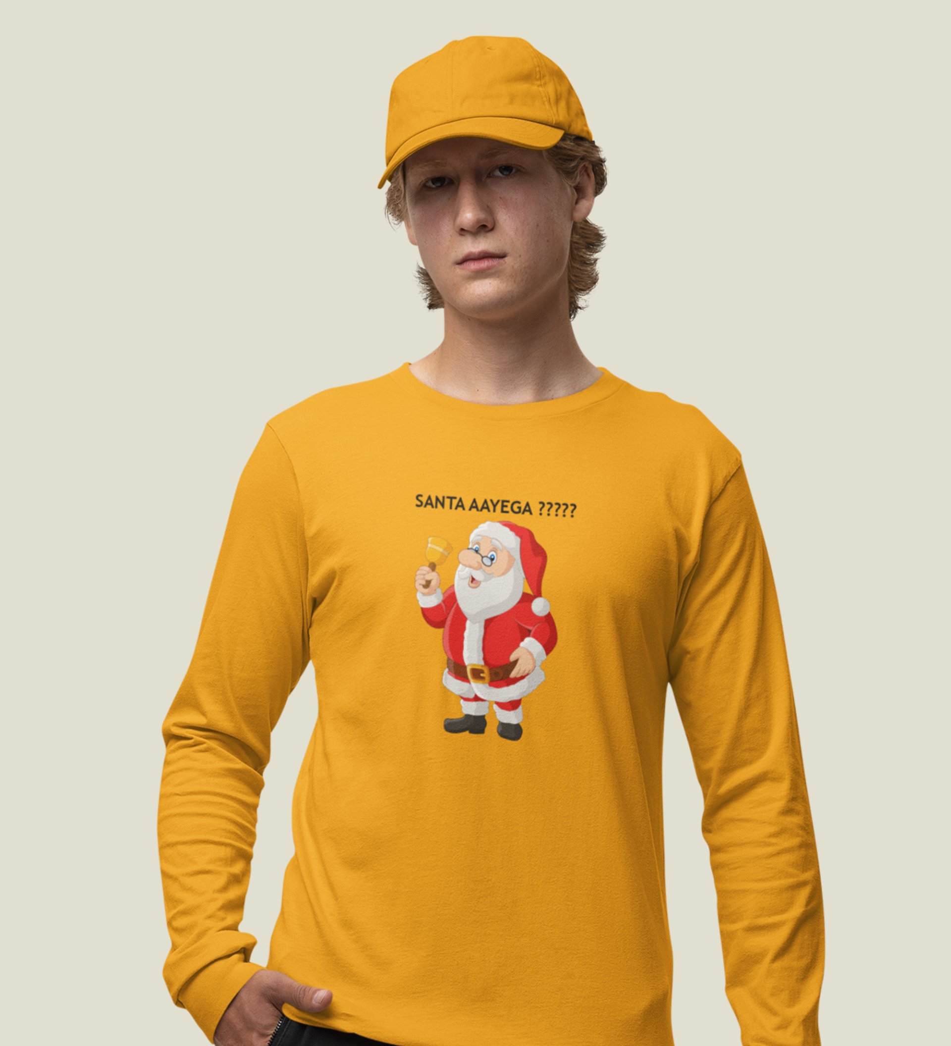 Curious Santa: Cute DesignerFull Sleeve T-shirt Yellow Best Gift For Kids Boys Girls