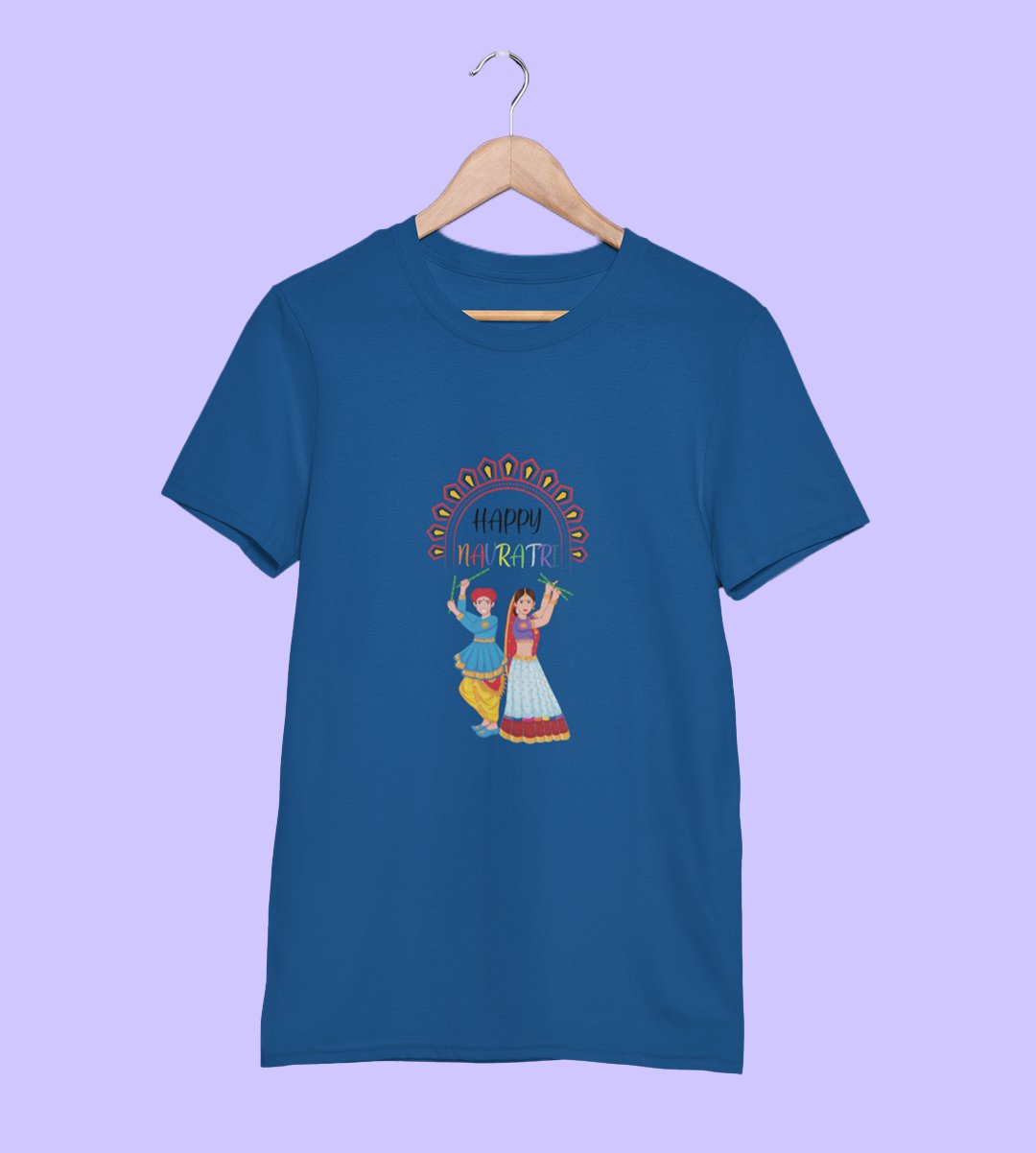 Dancing couple(traditional dress) printed unisex adults round neck cotton half-sleeve blue tshirt specially for Navratri festival/ Durga puja