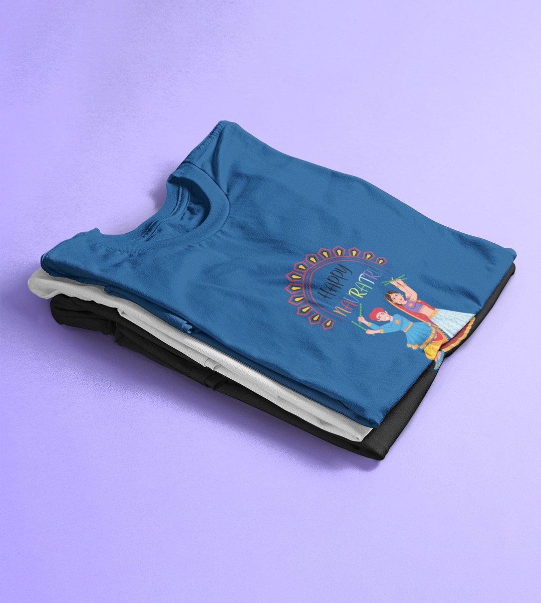 Navratri is a very auspicious festival for hindus. It takes place at the beginning of October and sometimes September. Enjoy the 9 days of festivities with full zeal and make yourself submerged in the love of Maa Durga. Navratri is also known as Durga Puja. And with this Tees, you can shine like a star during this festive season with our navratri themed cotton half sleeved Tshirts. You can pair our t-shirts with trousers and denim of your choice and make it a weekday smart casual or weekend wear. This is durable. This tshirt is smooth and soft which makes you comfortable to wear during all seasons. The printing in it is durable and odourless. It has five sizes, S,M,L,XL,XXL. The Tshirt colour is intact even after repeated washes. It can be kept in your wardrobe and hangers. Please avoid washing mashine to clean this Tee, it may affect the print. Hand wash only. We have brought you many navratri related designs printed on our different colour Tshirts to choose from. Grab it now.