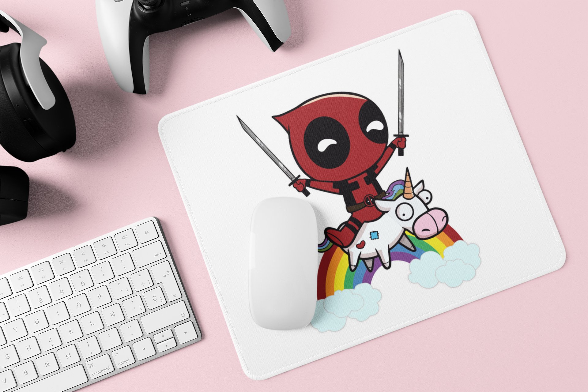 Deadpool sitting on unicorn - Printed animated Mousepad for animation lovers