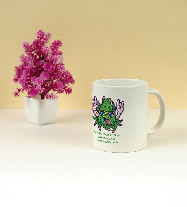 Start your day with a burst of vibrant energy! This printed coffee mug features a psychedelic leaf artwork surrounded by colorful flame-like patterns