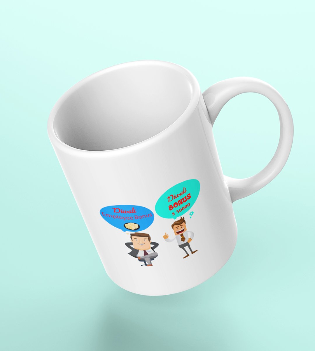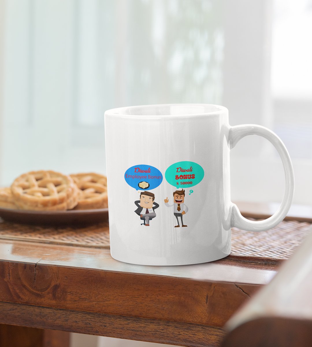 Unveil the comical side of Diwali bonuses with our "Diwali Bonus Dilemma" Coffee Mug. This witty design humorously contrasts employee expectations with the boss's perspective. Whether it's dreaming of 50,000 Rs or Sonpapdi, sip your coffee and share a laugh over the festive bonus conundrum.