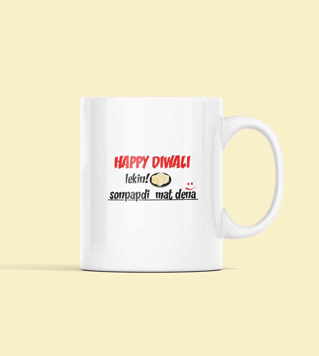 Add a delightful blend of humor and tradition to your Diwali with our "Diwali Laughter" Coffee Mug. The design features the heartwarming greeting "Happy Diwali," followed by the cheeky twist, "Lekin Sonpapdi mat dena :)." Sip your coffee with a side of laughter and embrace the lighthearted spirit of the festival.