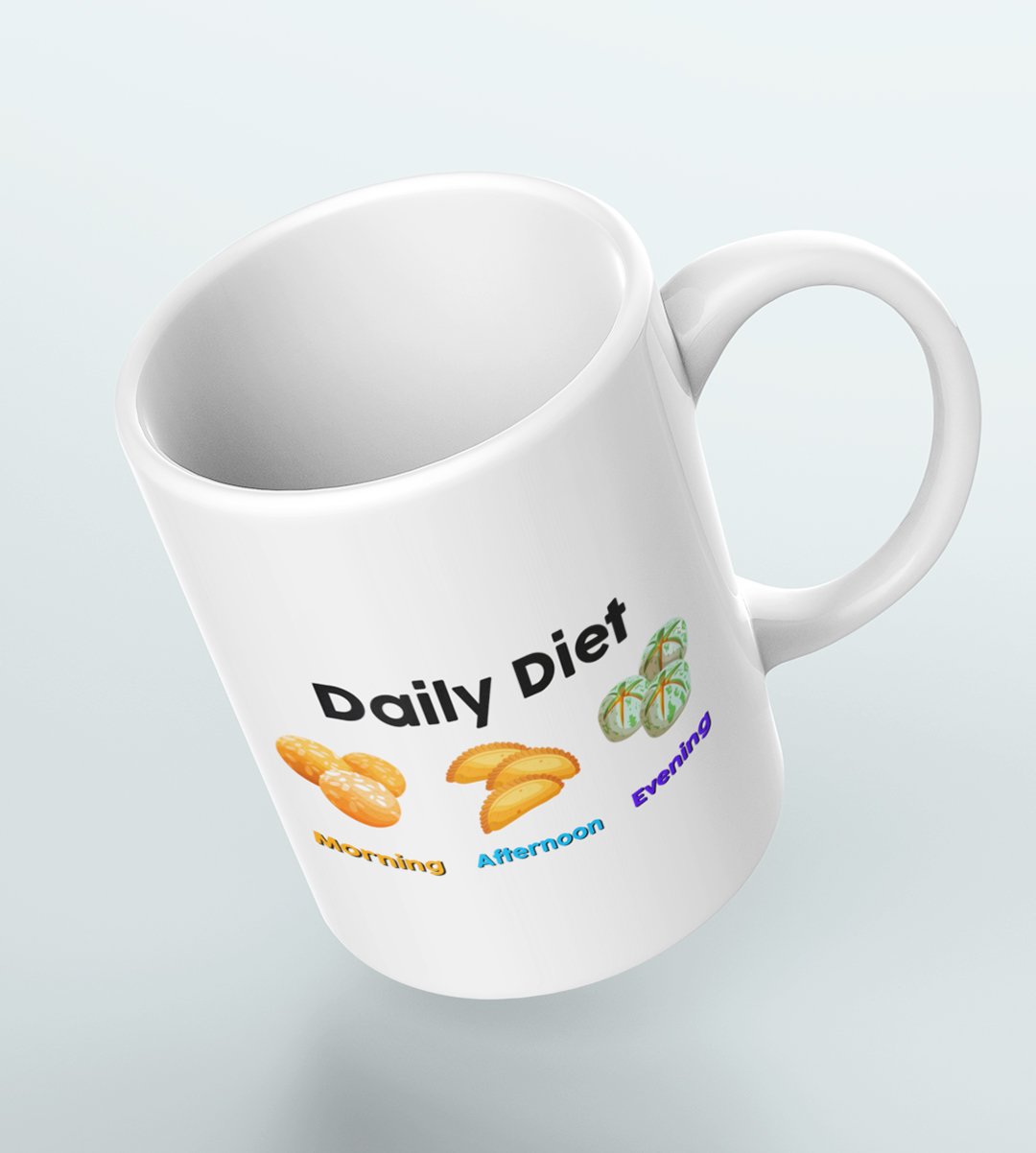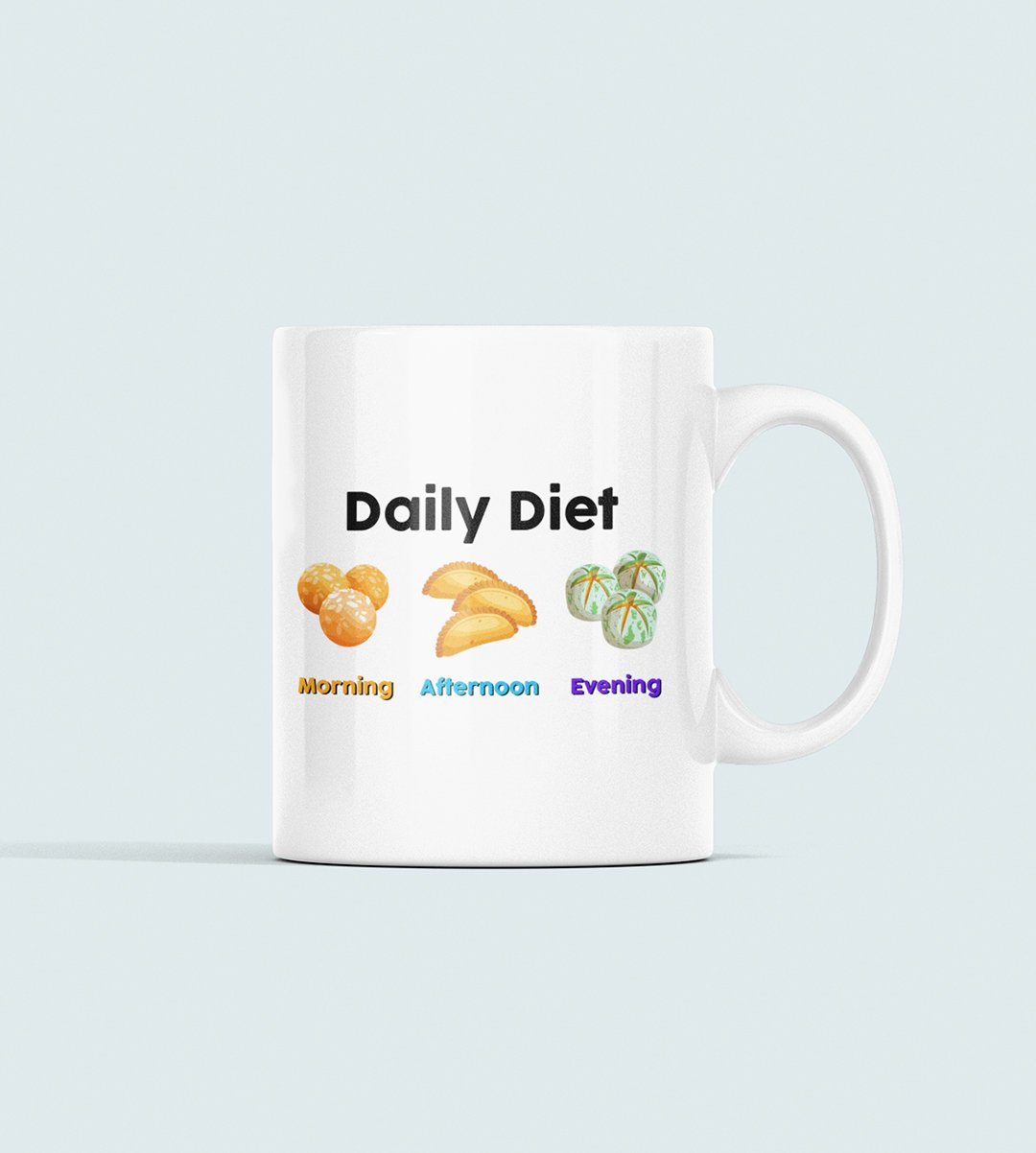 Indulge in the sweetest daily routine with our "Diwali Sweet Lover's Daily Diet" Coffee Mug. This hilarious design showcases the typical daily schedule of a sweet tooth, complete with morning, afternoon, and evening sweets. It's a delightful reminder that every hour is a good time for dessert. Enjoy your favorite beverages with a touch of humor and sweetness during the festival of lights.
