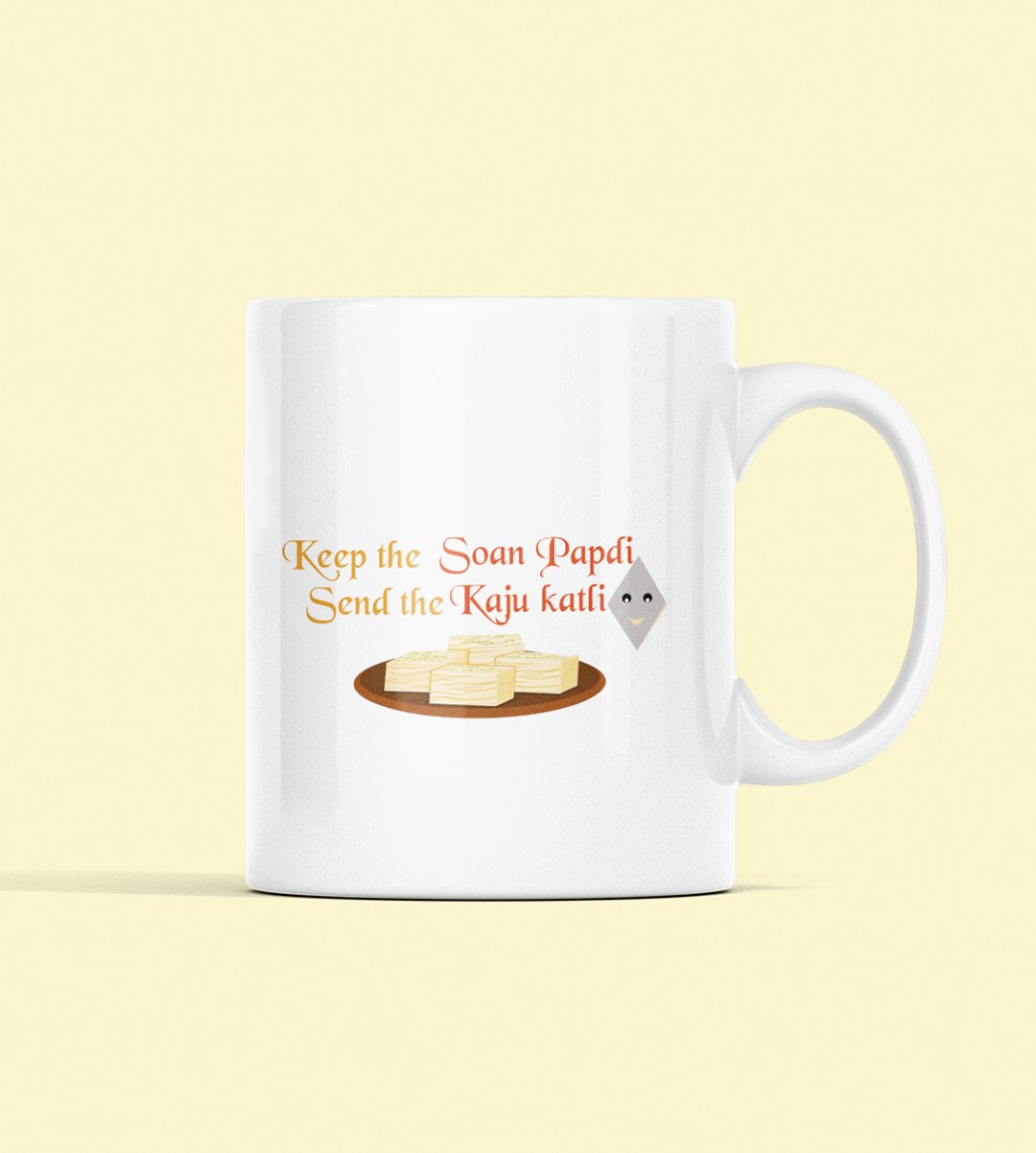 Indulge in the sweetness of Diwali with our "Diwali Sweets Delight" Coffee Mug. The witty message "Keep the Sonpapdi, Send the Kaju Katli" adds a lighthearted touch to the festive season. Sip your coffee and savor the flavors of Diwali with this delightful mug.