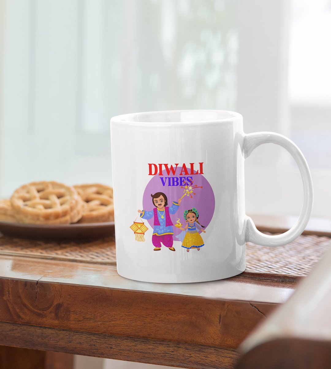 Embrace the festive "Diwali Vibes" with our Coffee Mug, beautifully cherishing heartwarming moments between a father and daughter. This design encapsulates the joy and togetherness that define the festival. Sip your coffee and relive the love and warmth shared during Diwali with this endearing mug