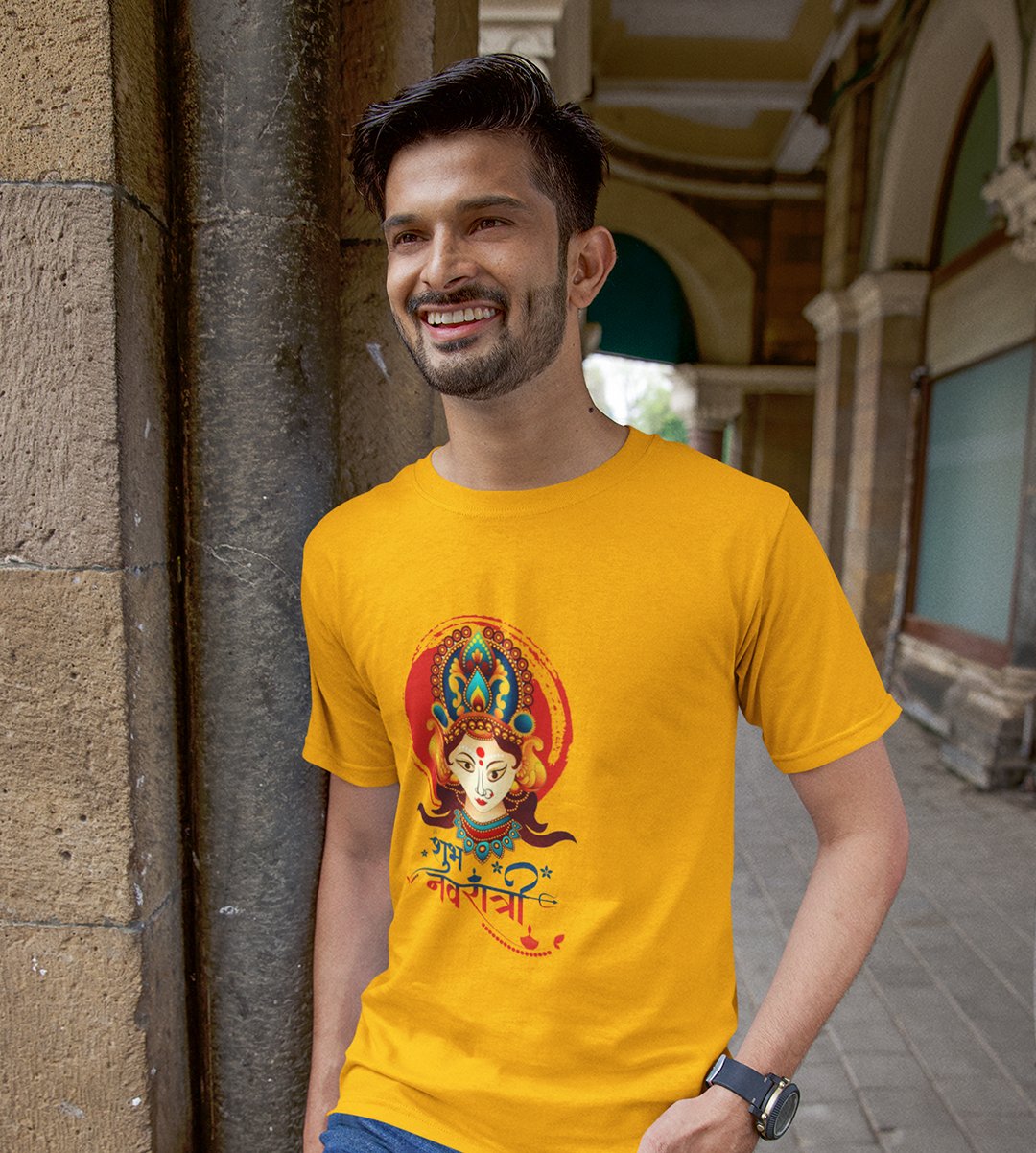 Navratri is a very auspicious festival for hindus. It takes place at the beginning of October and sometimes September. Enjoy the 9 days of festivities with full zeal and make yourself submerged in the love of Maa Durga. Navratri is also known as Durga Puja. And with this Tees, you can shine like a star during this festive season with our navratri themed cotton half sleeved Tshirts. You can pair our t-shirts with trousers and denim of your choice and make it a weekday smart casual or weekend wear. This is durable. This tshirt is smooth and soft which makes you comfortable to wear during all seasons. The printing in it is durable and odourless. It has five sizes, S,M,L,XL,XXL. The Tshirt colour is intact even after repeated washes. It can be kept in your wardrobe and hangers. Please avoid washing mashine to clean this Tee, it may affect the print. Hand wash only. We have brought you many navratri related designs printed on our different colour Tshirts to choose from. Grab it now.