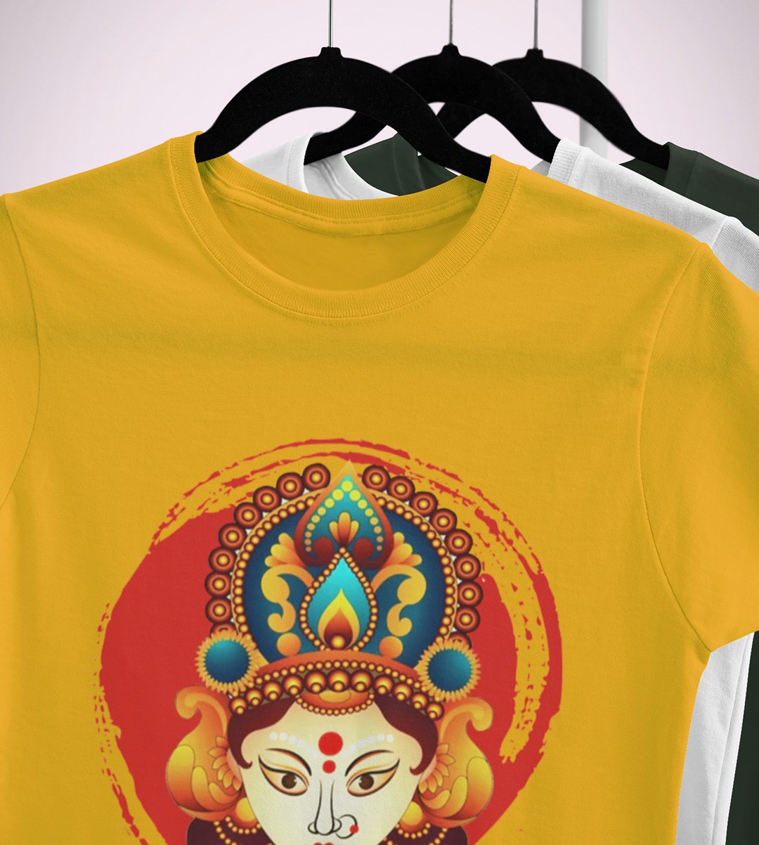 Durga maa animated printed unisex adults round neck cotton half-sleeve yellow tshirt specially for Navratri festival/ Durga puja