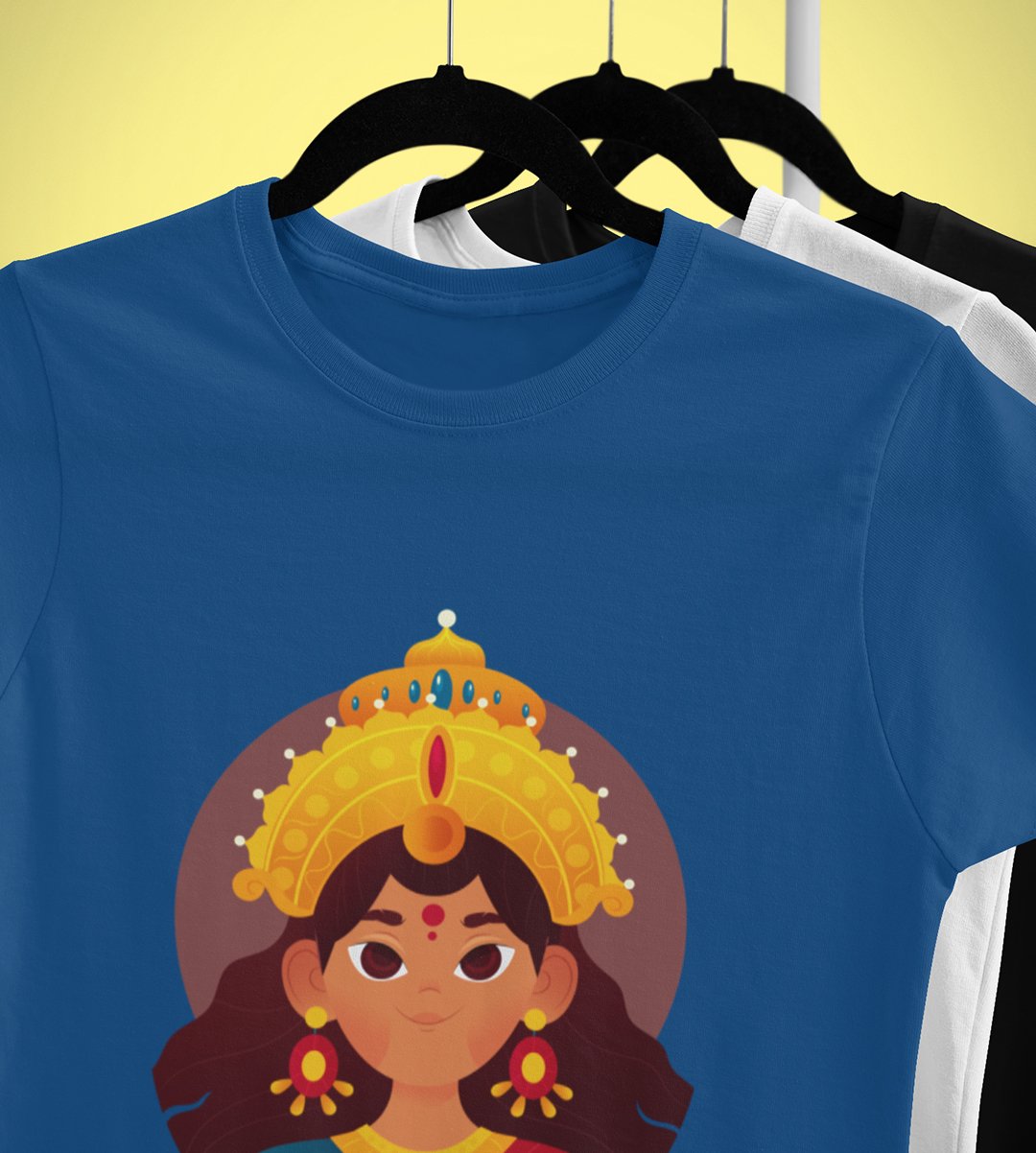 Navratri is a very auspicious festival for hindus. It takes place at the beginning of October and sometimes September. Enjoy the 9 days of festivities with full zeal and make yourself submerged in the love of Maa Durga. Navratri is also known as Durga Puja. And with this Tees, you can shine like a star during this festive season with our navratri themed cotton half sleeved Tshirts. You can pair our t-shirts with trousers and denim of your choice and make it a weekday smart casual or weekend wear. This is durable. This tshirt is smooth and soft which makes you comfortable to wear during all seasons. The printing in it is durable and odourless. It has five sizes, S,M,L,XL,XXL. The Tshirt colour is intact even after repeated washes. It can be kept in your wardrobe and hangers. Please avoid washing mashine to clean this Tee, it may affect the print. Hand wash only. We have brought you many navratri related designs printed on our different colour Tshirts to choose from. Grab it now.
