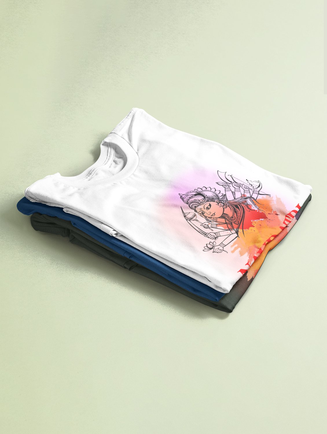 Navratri is a very auspicious festival for hindus. It takes place at the beginning of October and sometimes September. Enjoy the 9 days of festivities with full zeal and make yourself submerged in the love of Maa Durga. Navratri is also known as Durga Puja. And with this Tees, you can shine like a star during this festive season with our navratri themed cotton half sleeved Tshirts. You can pair our t-shirts with trousers and denim of your choice and make it a weekday smart casual or weekend wear. This is durable. This tshirt is smooth and soft which makes you comfortable to wear during all seasons. The printing in it is durable and odourless. It has five sizes, S,M,L,XL,XXL. The Tshirt colour is intact even after repeated washes. It can be kept in your wardrobe and hangers. Please avoid washing mashine to clean this Tee, it may affect the print. Hand wash only. We have brought you many navratri related designs printed on our different colour Tshirts to choose from. Grab it now.
