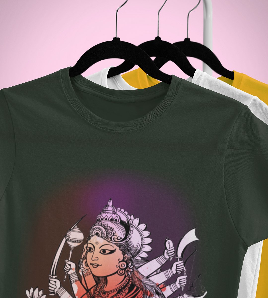 Durga maa idol printed unisex adults round neck cotton half-sleeve green tshirt specially for Navratri festival/ Durga puja