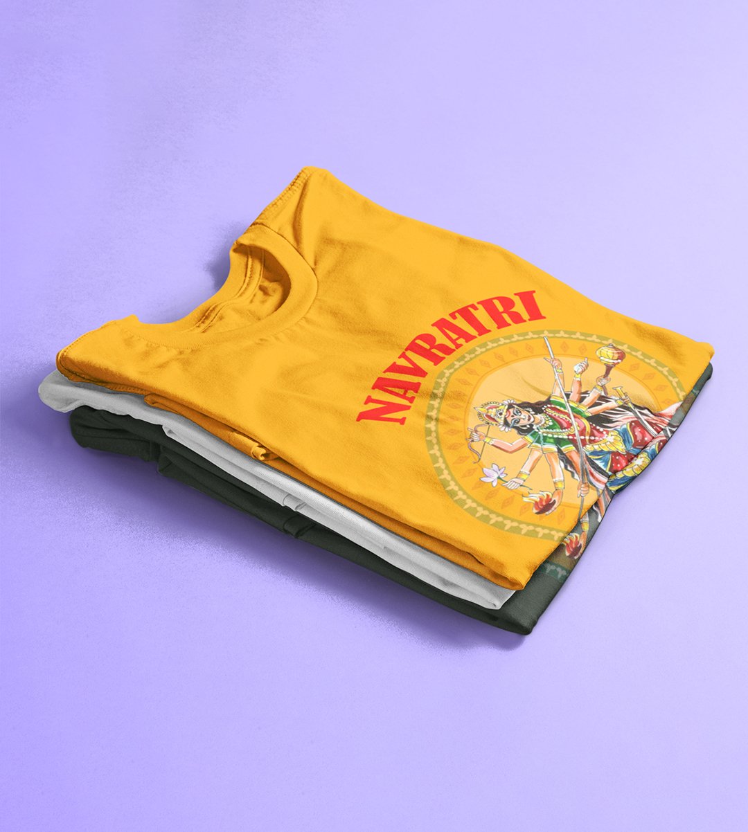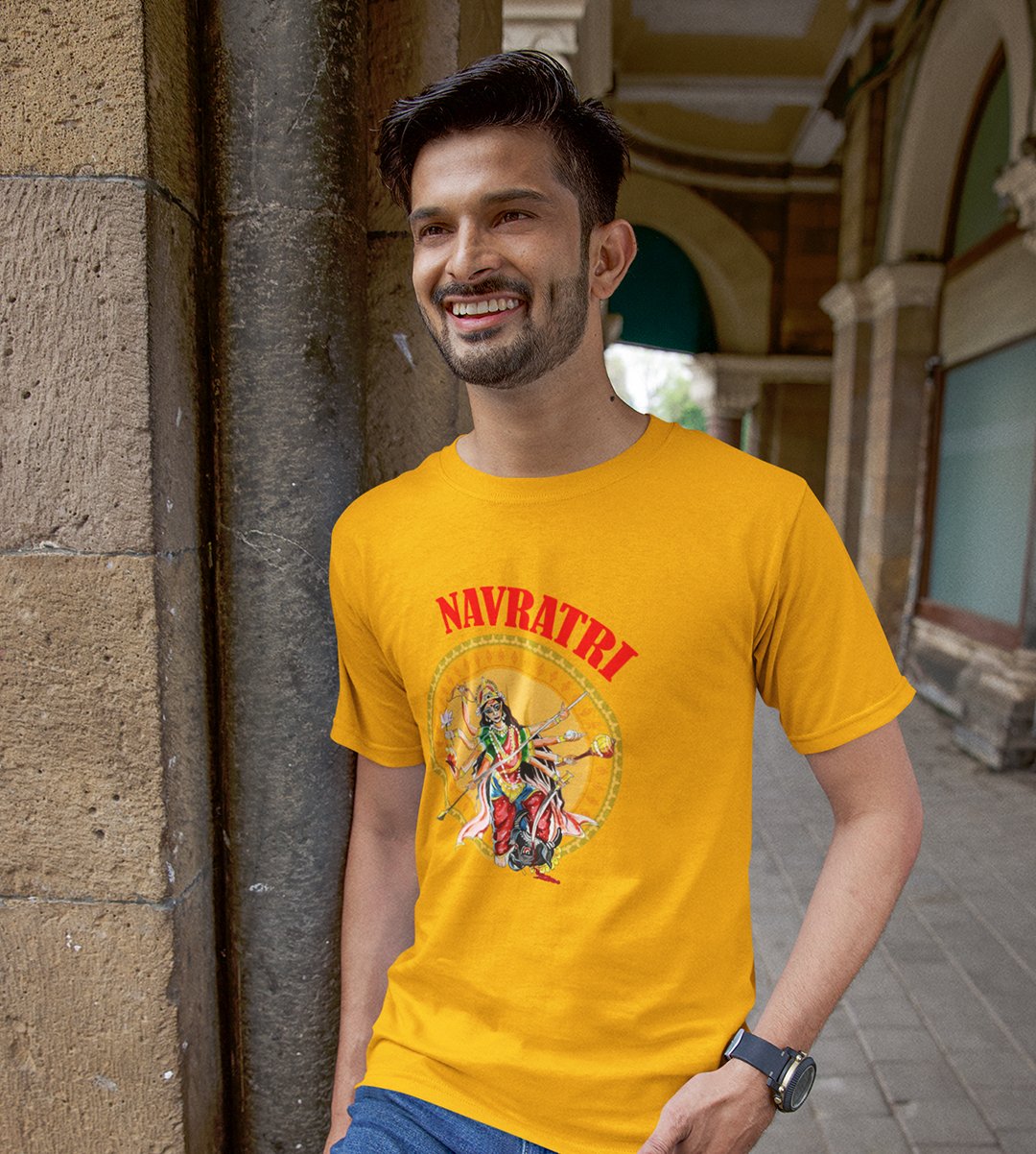 Navratri is a very auspicious festival for hindus. It takes place at the beginning of October and sometimes September. Enjoy the 9 days of festivities with full zeal and make yourself submerged in the love of Maa Durga. Navratri is also known as Durga Puja. And with this Tees, you can shine like a star during this festive season with our navratri themed cotton half sleeved Tshirts. You can pair our t-shirts with trousers and denim of your choice and make it a weekday smart casual or weekend wear. This is durable. This tshirt is smooth and soft which makes you comfortable to wear during all seasons. The printing in it is durable and odourless. It has five sizes, S,M,L,XL,XXL. The Tshirt colour is intact even after repeated washes. It can be kept in your wardrobe and hangers. Please avoid washing mashine to clean this Tee, it may affect the print. Hand wash only. We have brought you many navratri related designs printed on our different colour Tshirts to choose from. Grab it now.
