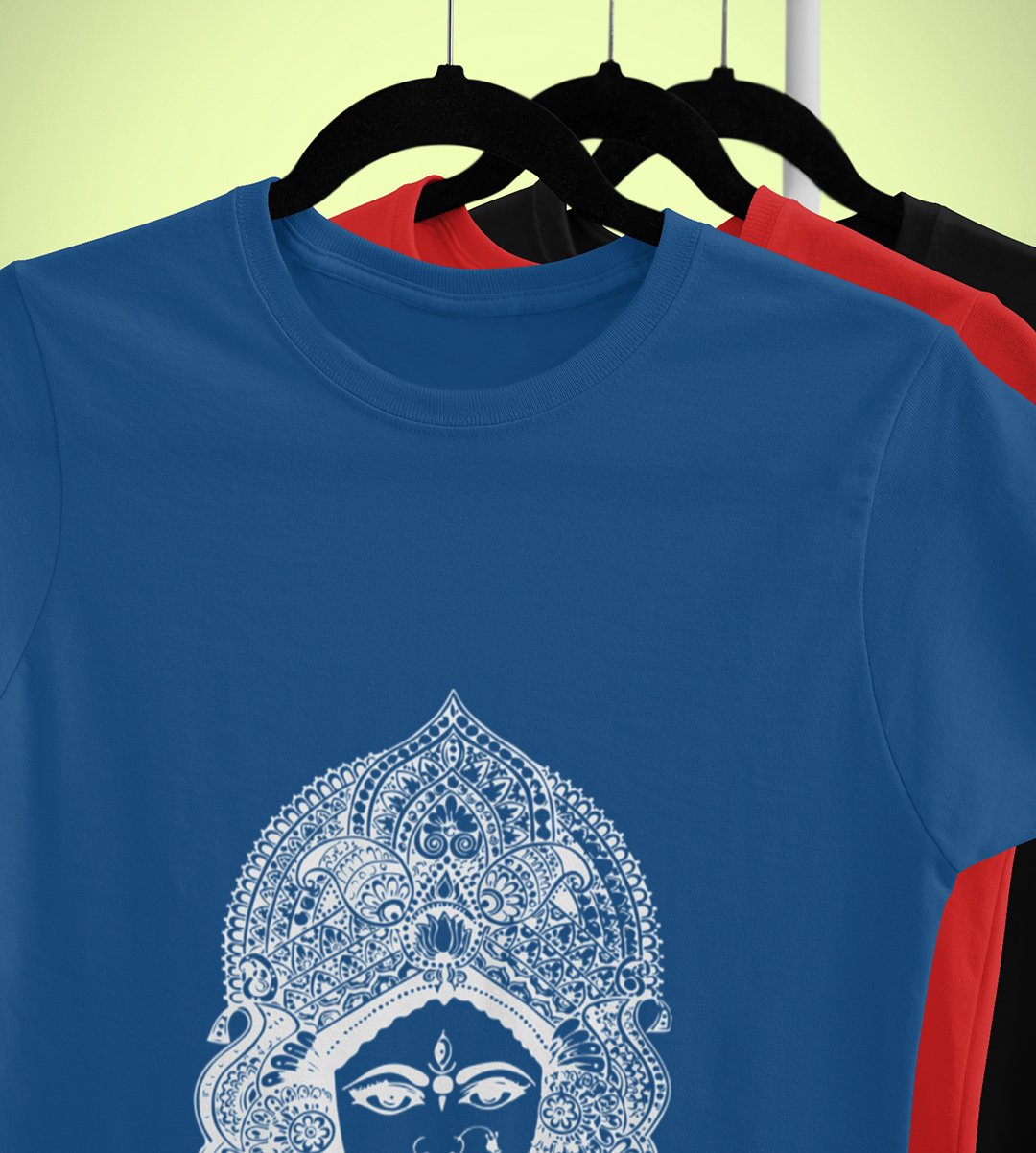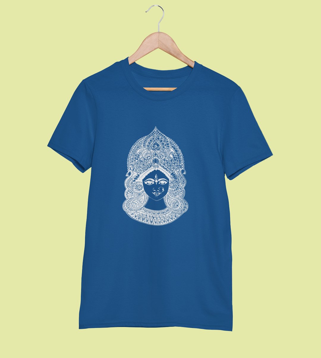 Durga maa potrait printed unisex adults round neck cotton half-sleeve blue tshirt specially for Navratri festival/ Durga puja