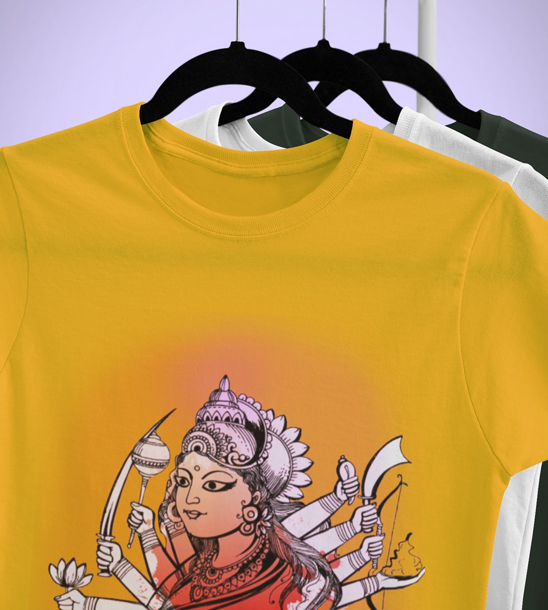 Durga maa (sidefaced) printed unisex adults round neck cotton half-sleeve yellow tshirt specially for Navratri festival/ Durga puja